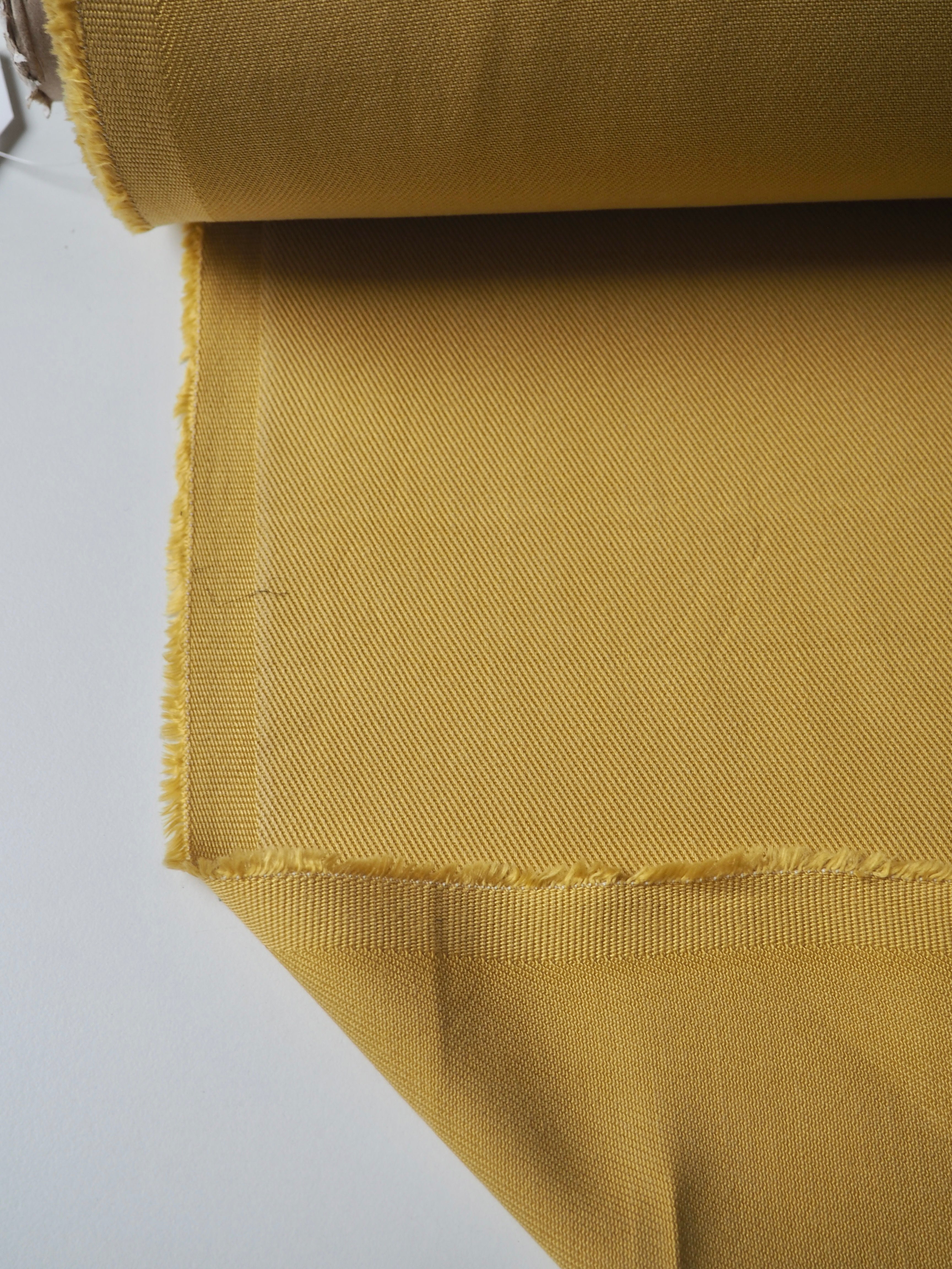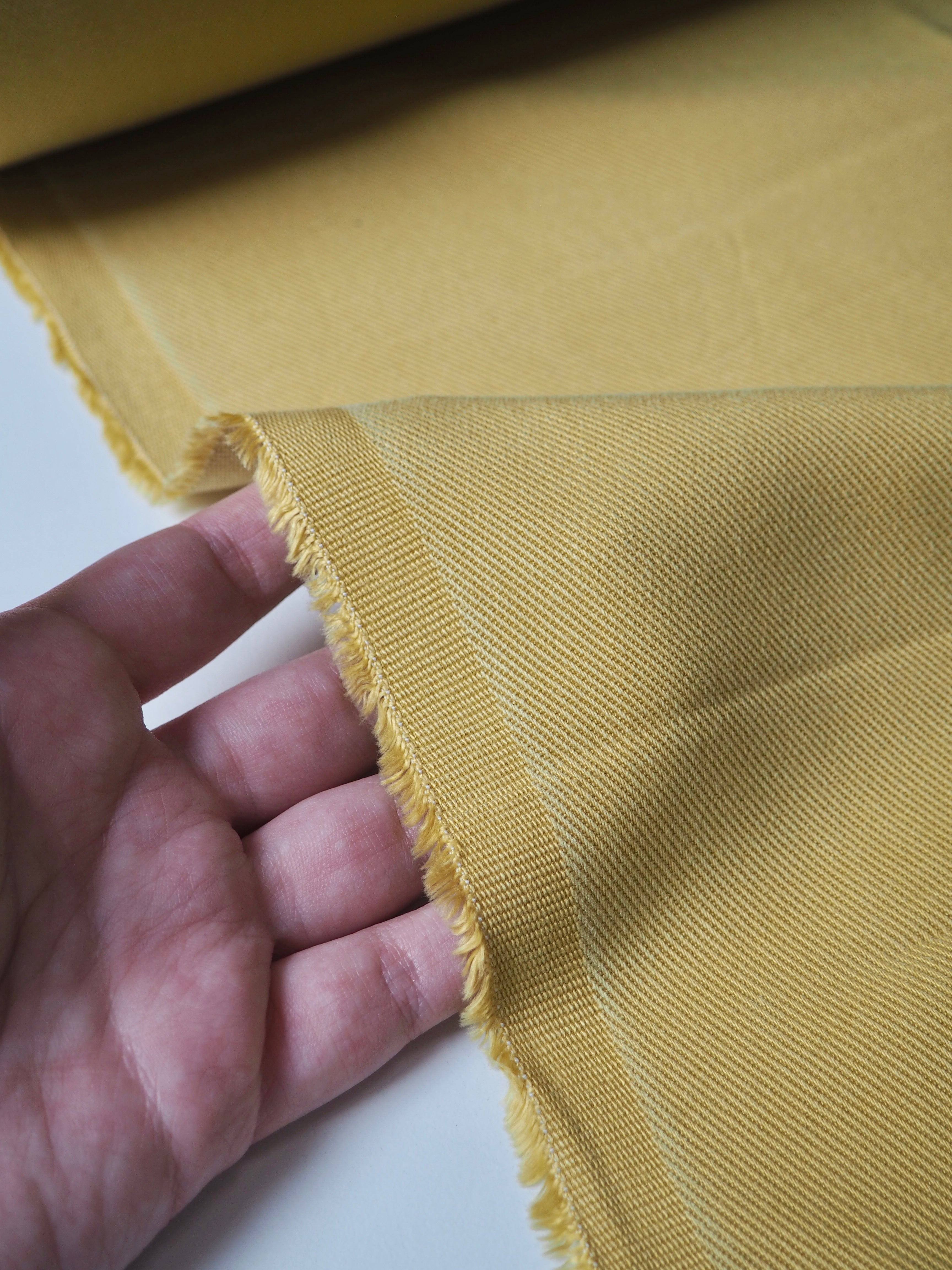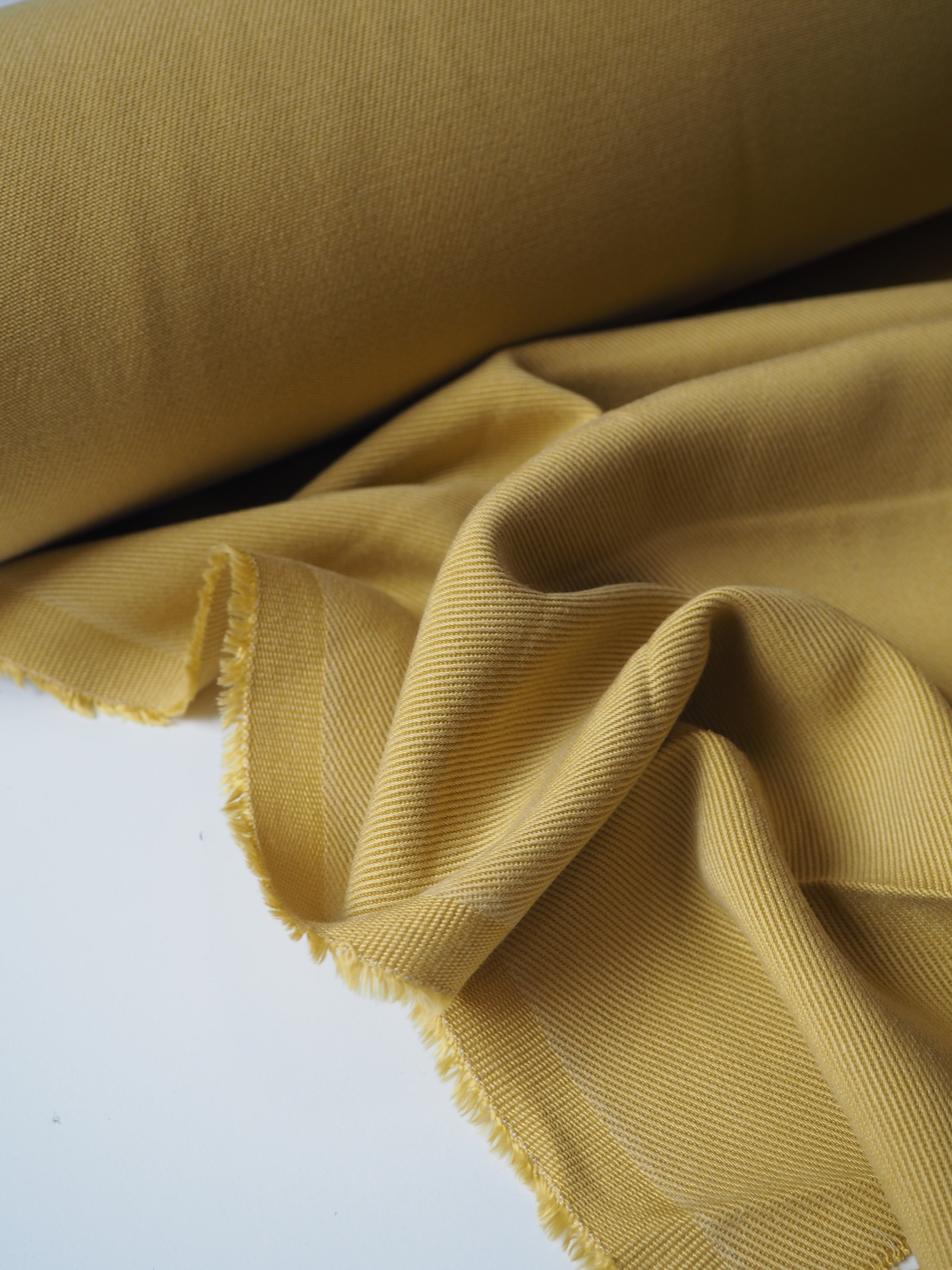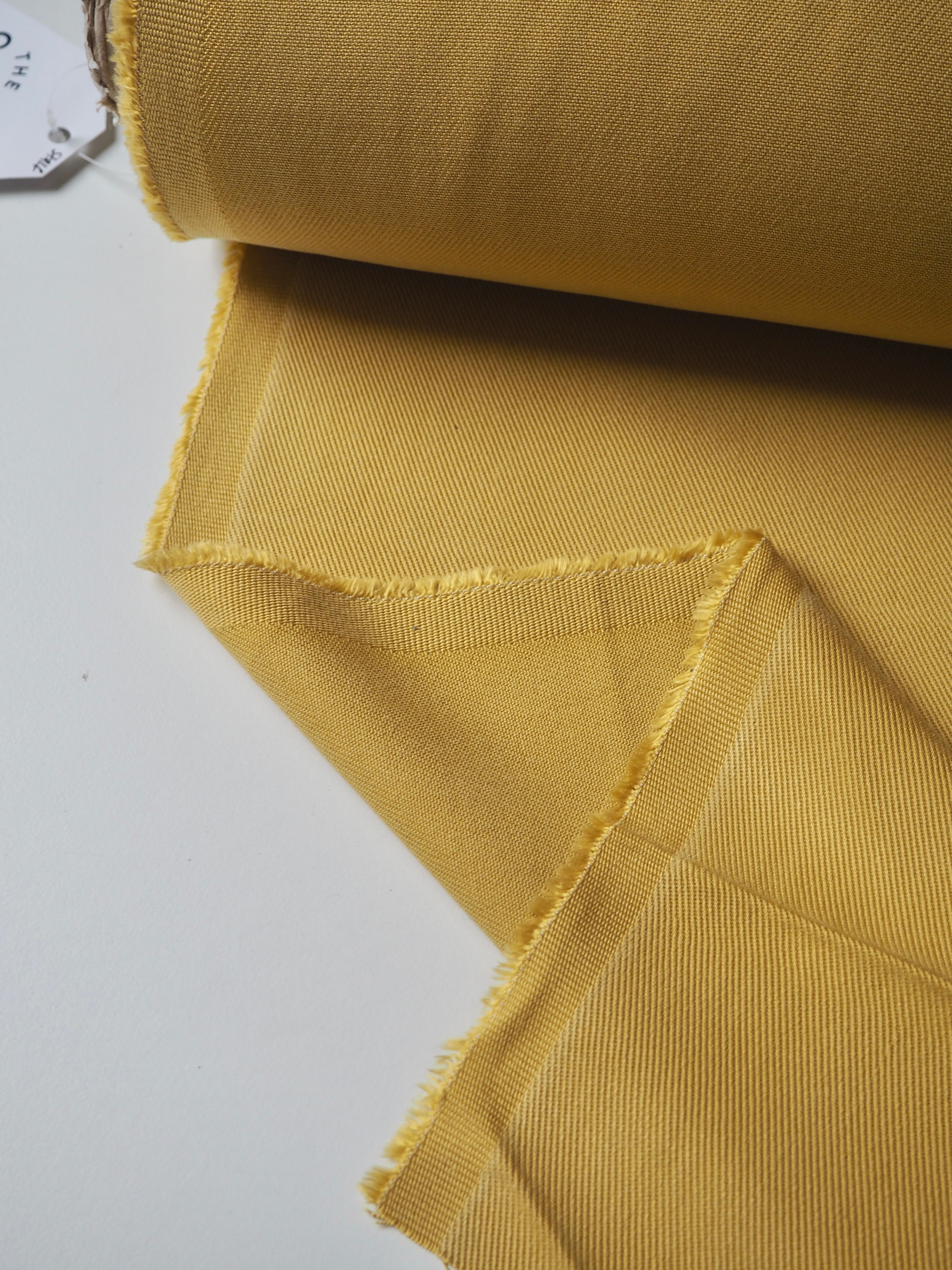This ex-designer fabric is a Tencel twill. In an earthy saffron spice colour, and light to medium weight with a gentle drape. Has a classic twill texture, and very soft handle that feels a bit washed. Would be perfect for trousers!