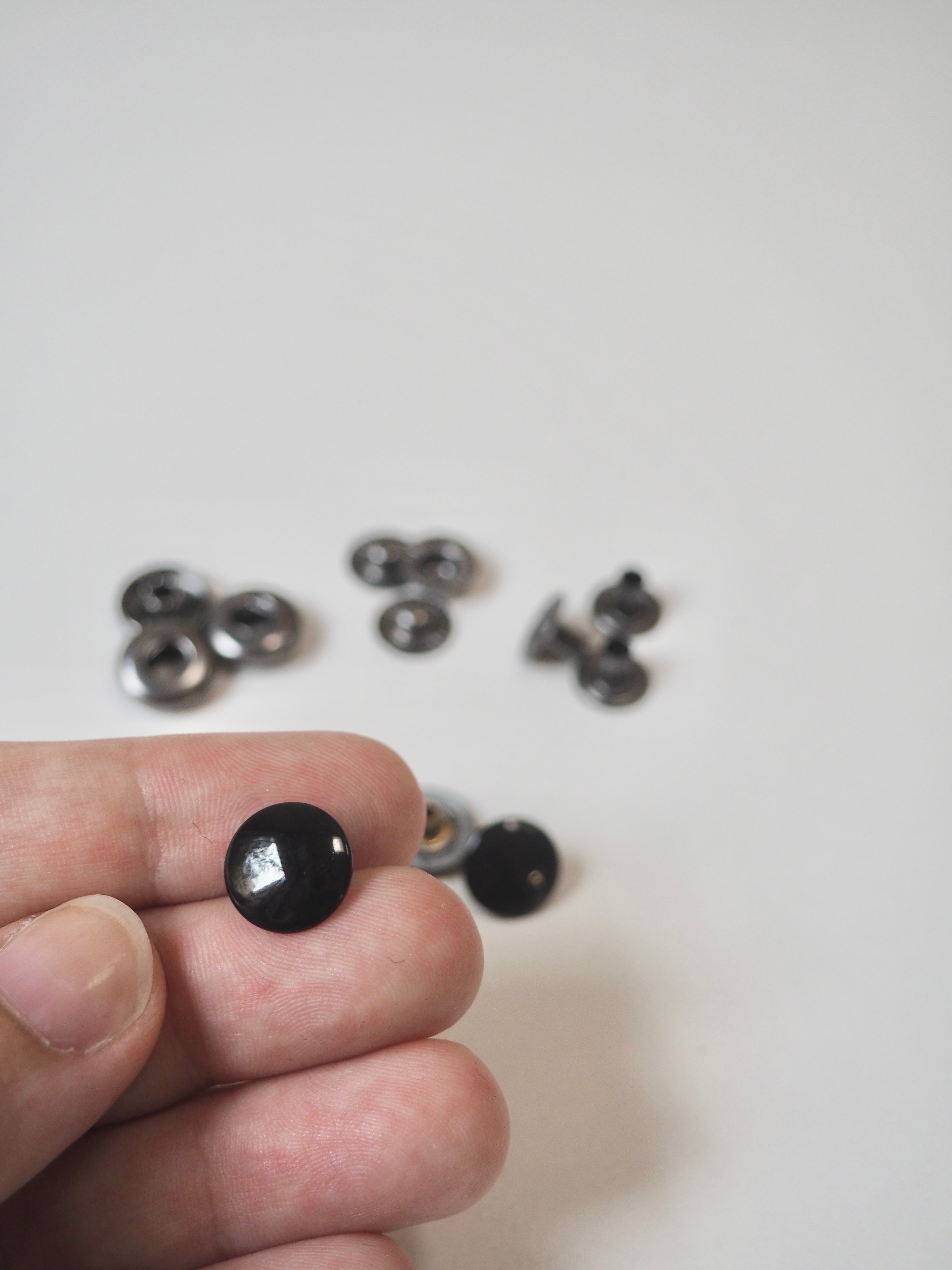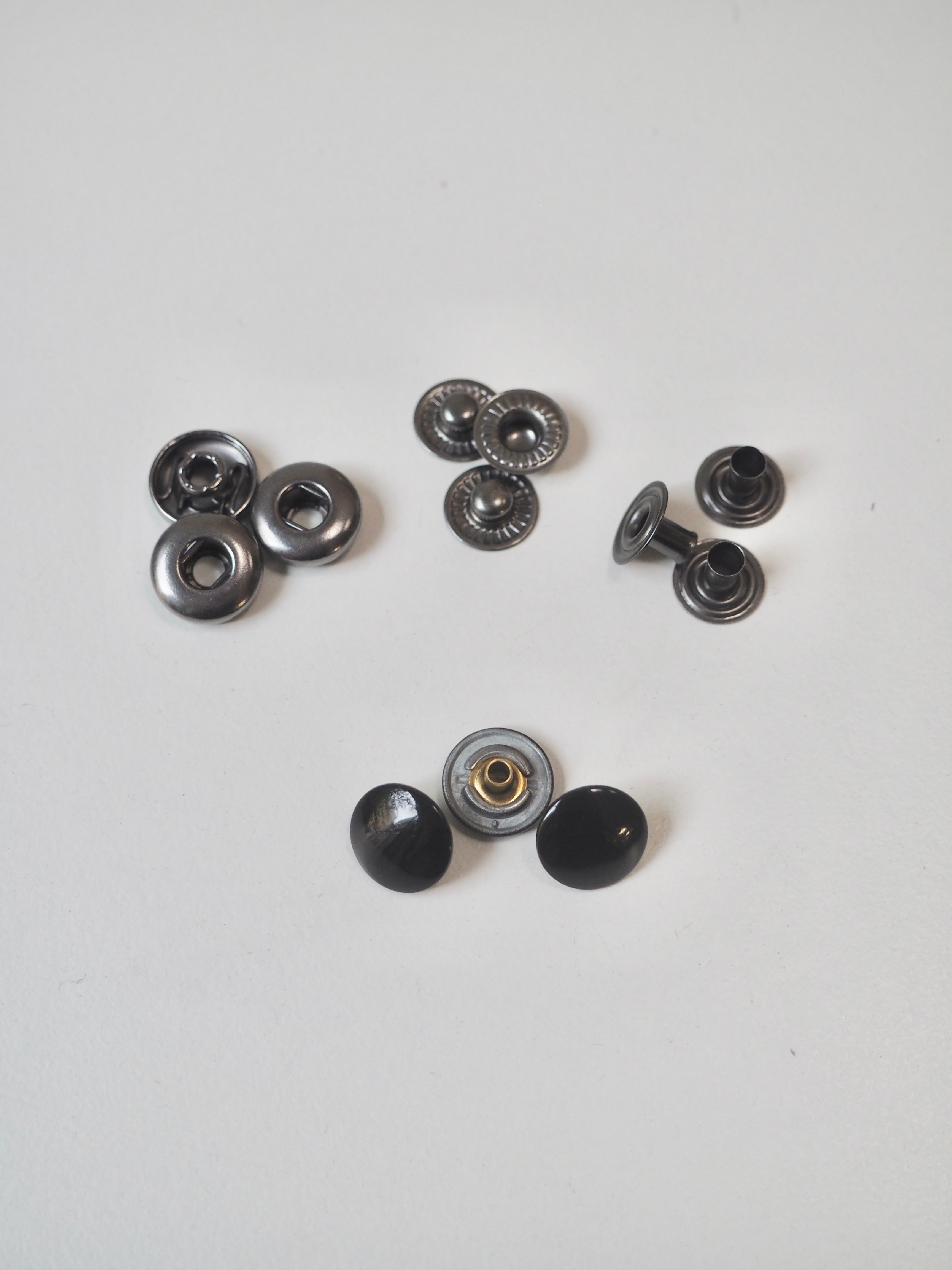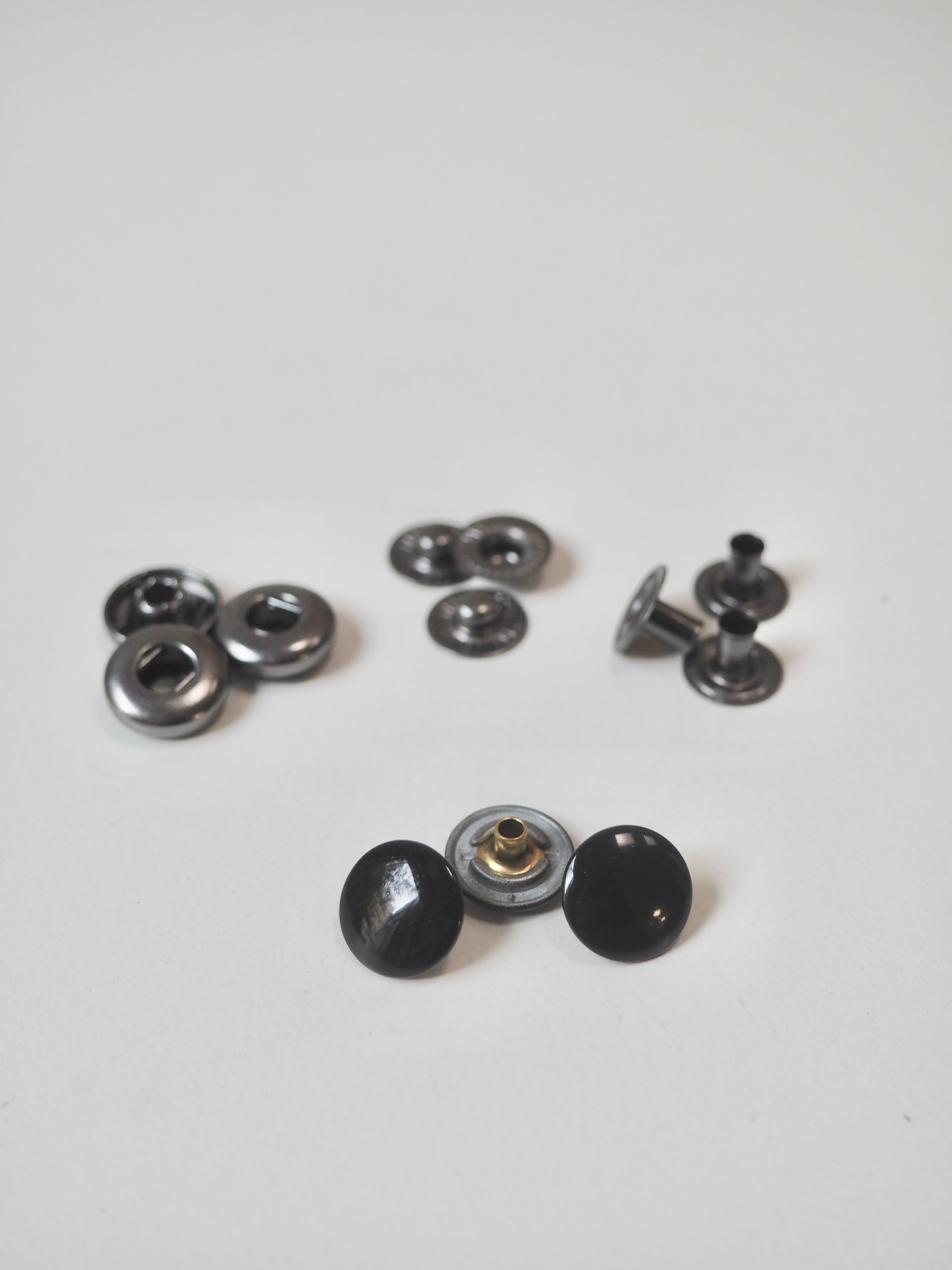 This ex-designer hardware is a press stud set. These press studs, also known as poppers or snaps, are all gunmetal components, with a shiny black top piece. They require a die set/machine for the right size. Ideal for shirts and jackets but could also be used in bag making!