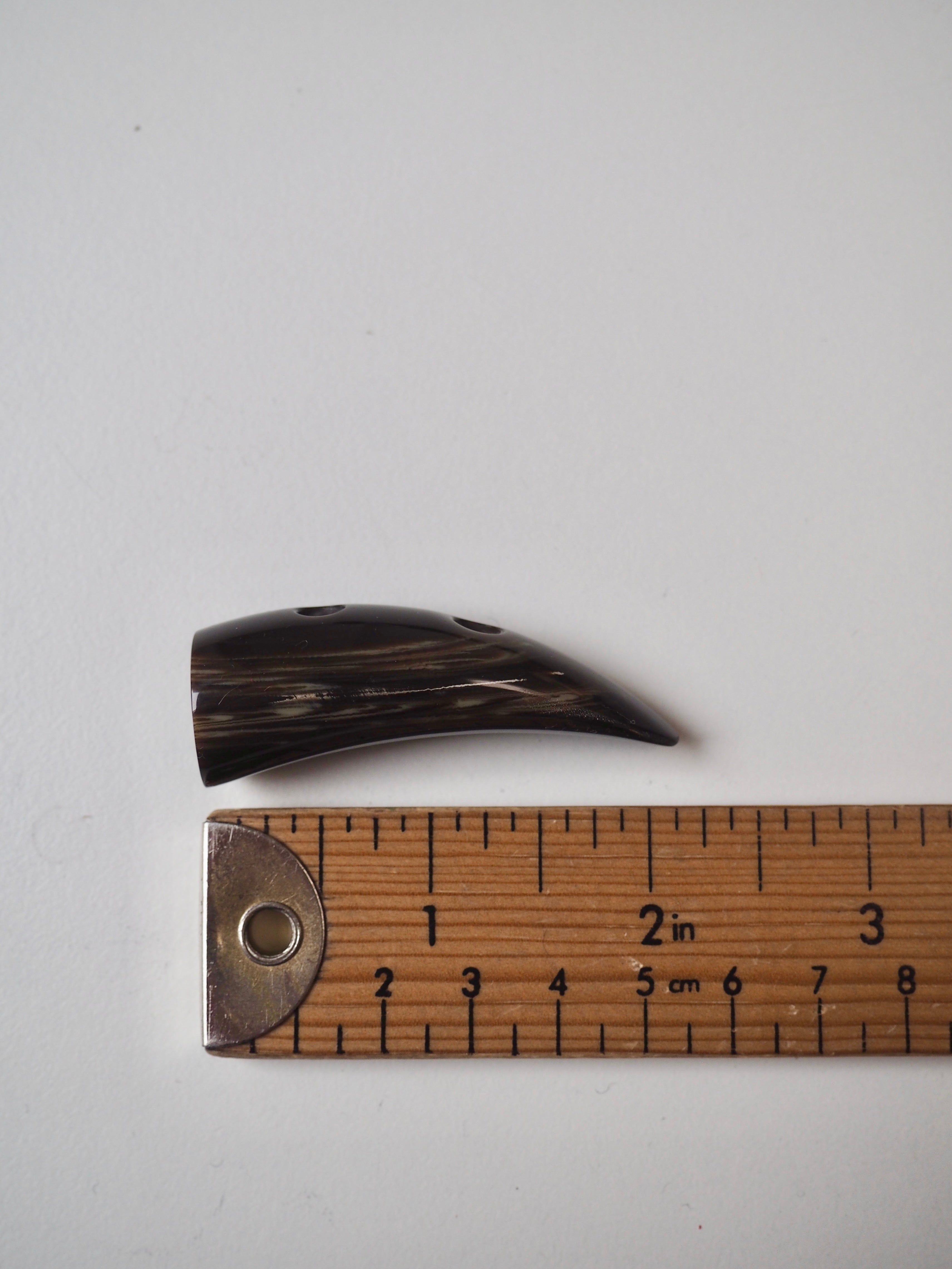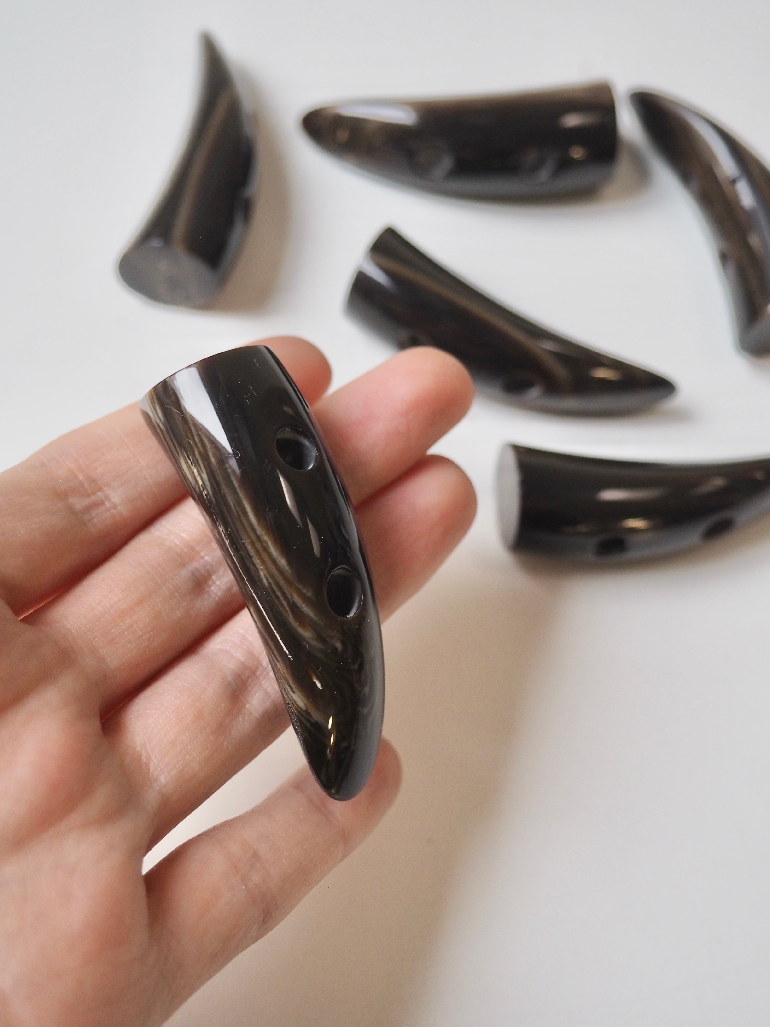 This ex-designer fastening is a horn duffle toggle. It's dark brown marled with cream with a shiny finish. Very smooth and chic. Great for adding a unique finish around a cord. Really high quality, would look amazing on a coat!