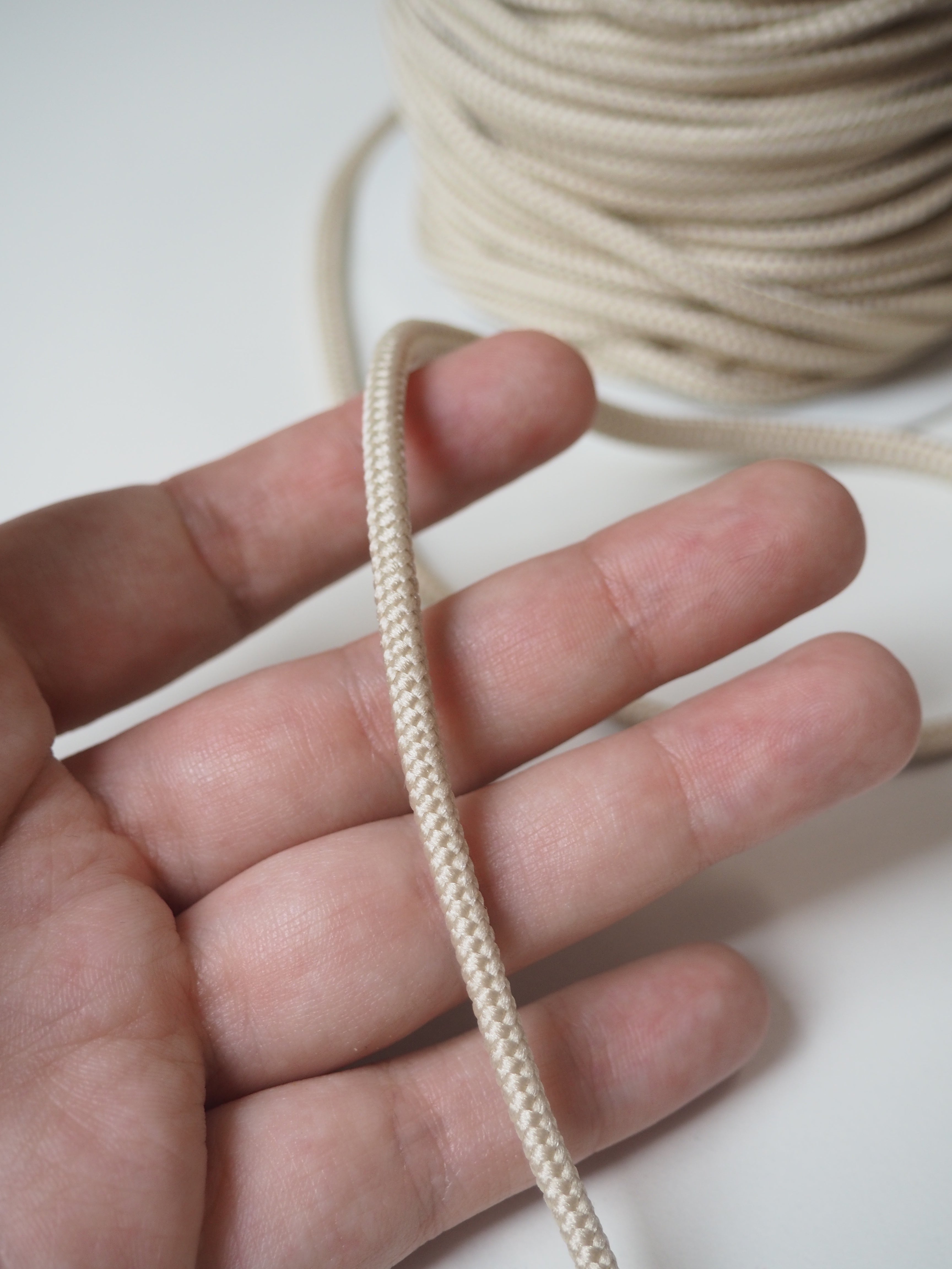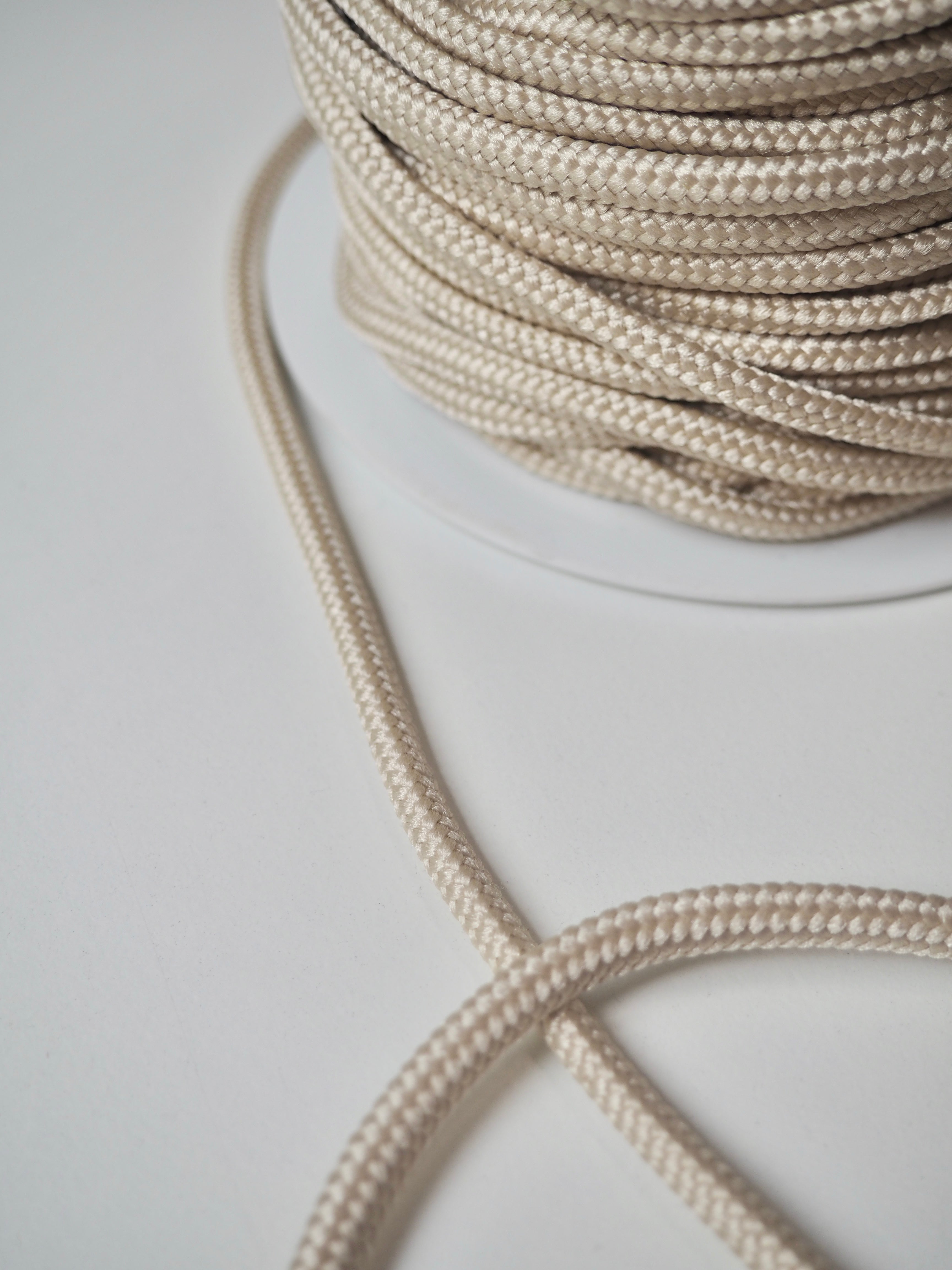 This ex-designer trim is a braided cord. Perfect for ties on home furnishings, or as a drawstring on a garments. It could also be used for macrame and would look great as a plant hanger!