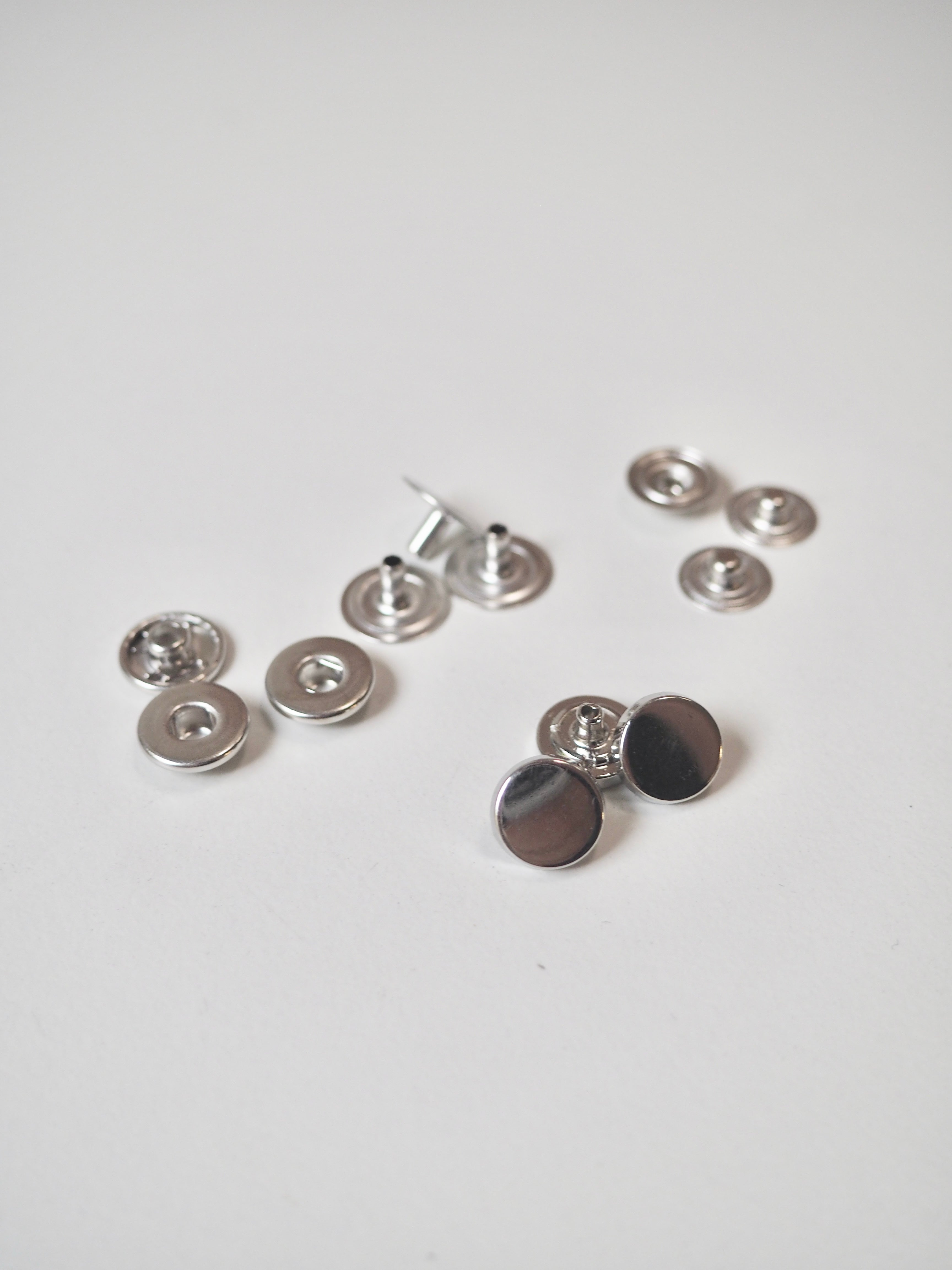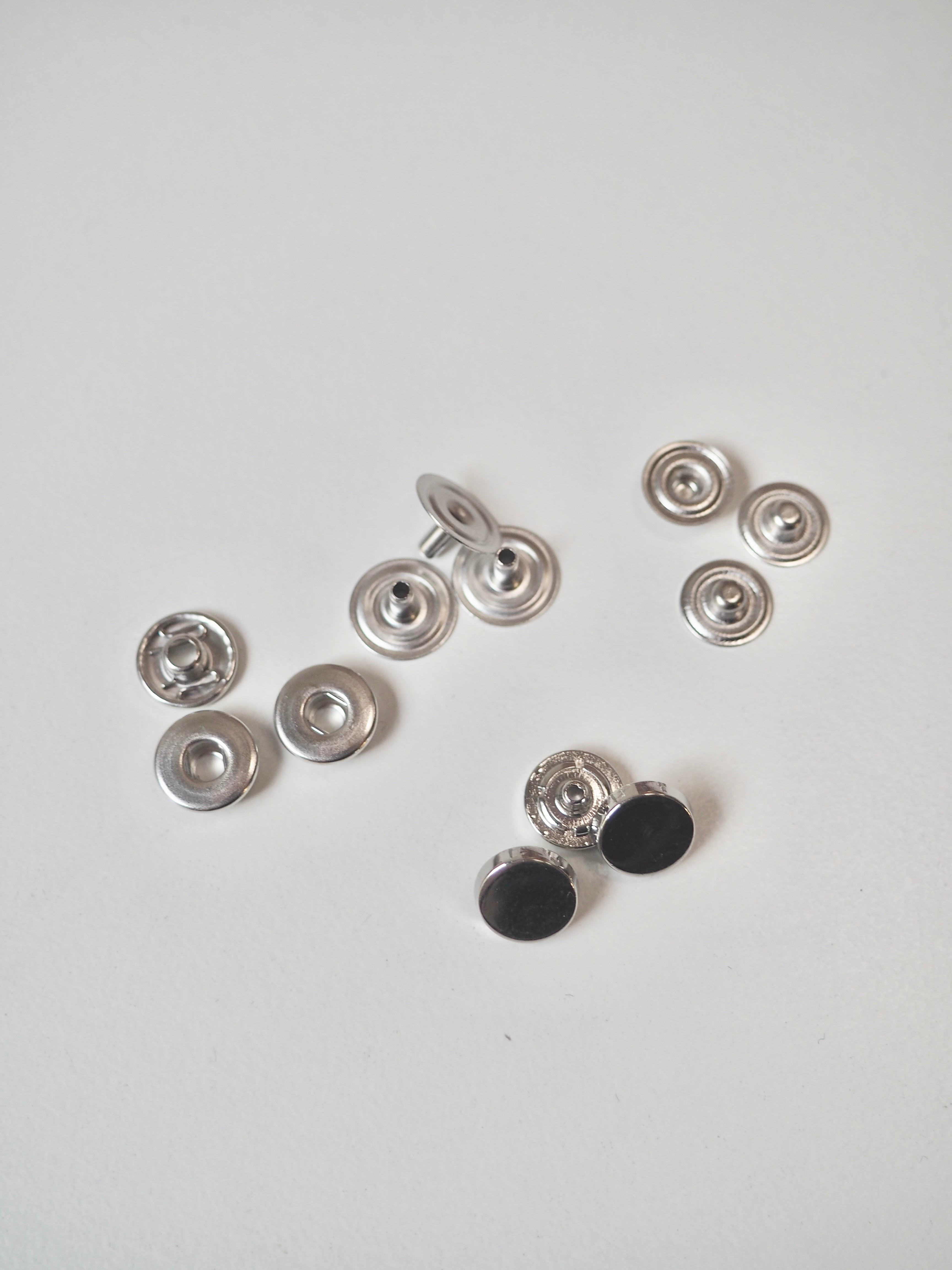 This ex-designer hardware is a press stud set. These press studs, also known as poppers or snaps, are all silver components, with a shiny, chunkier top piece. They require a die set/machine for the right size. Ideal for shirts and jackets but could also be used in bag making!