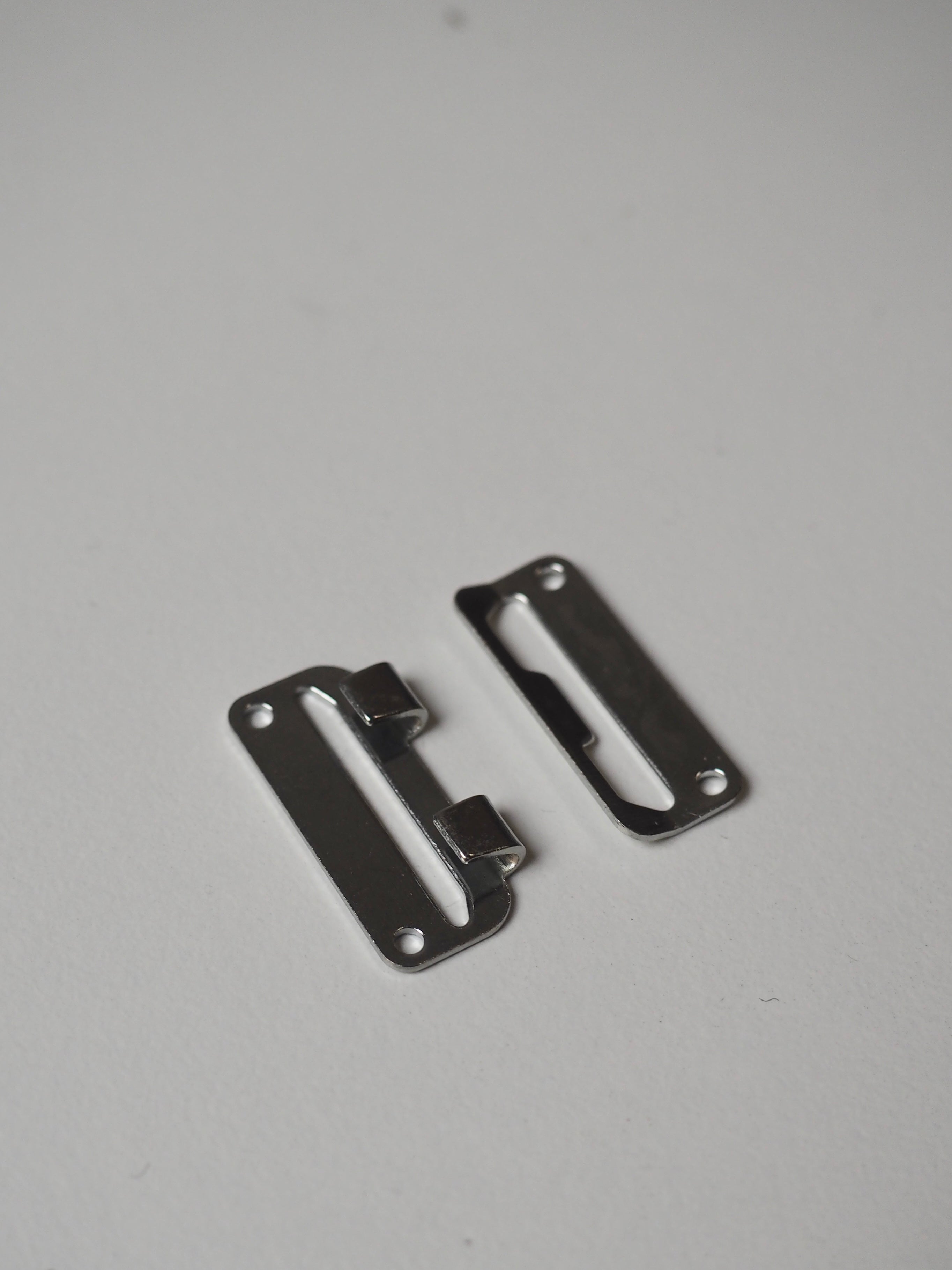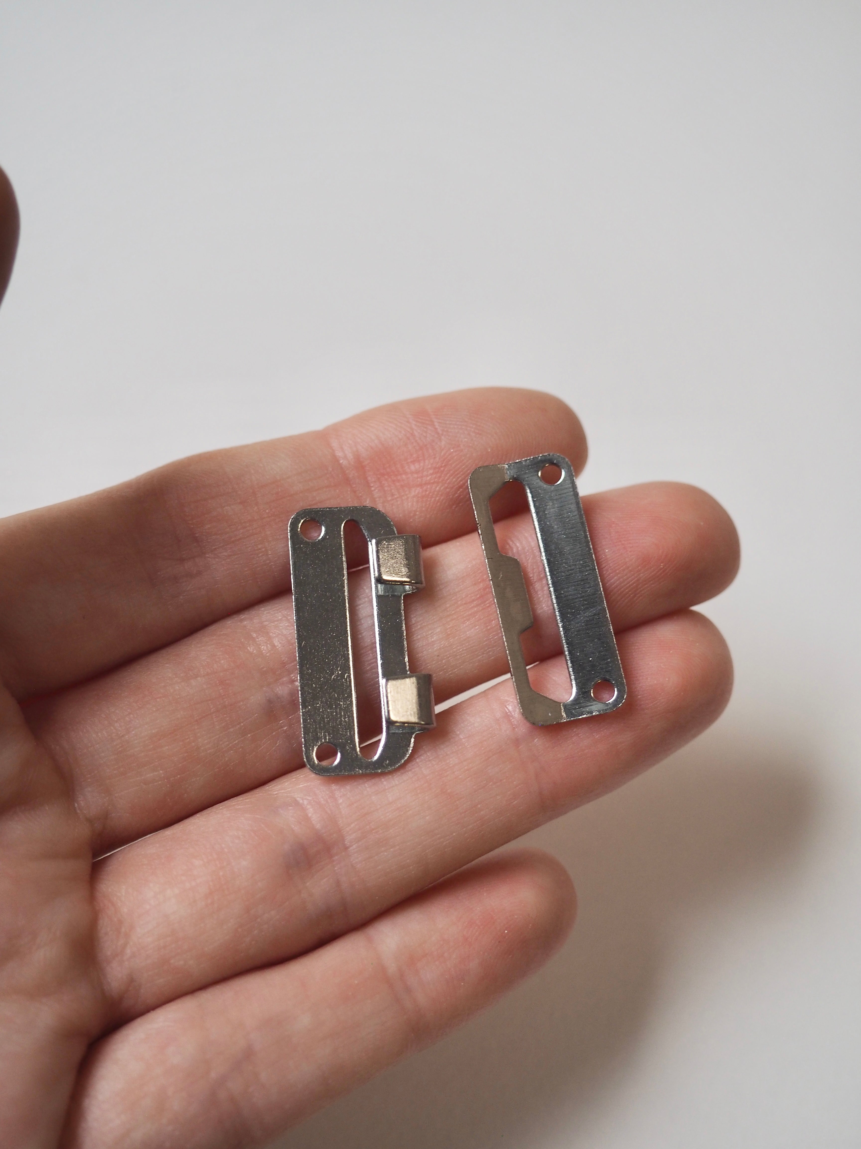 This ex-designer hardware is a hook and bar. It has a shiny silver finish with two hooks. Perfect for a closure on a pair of trousers, a jacket, or a coat.