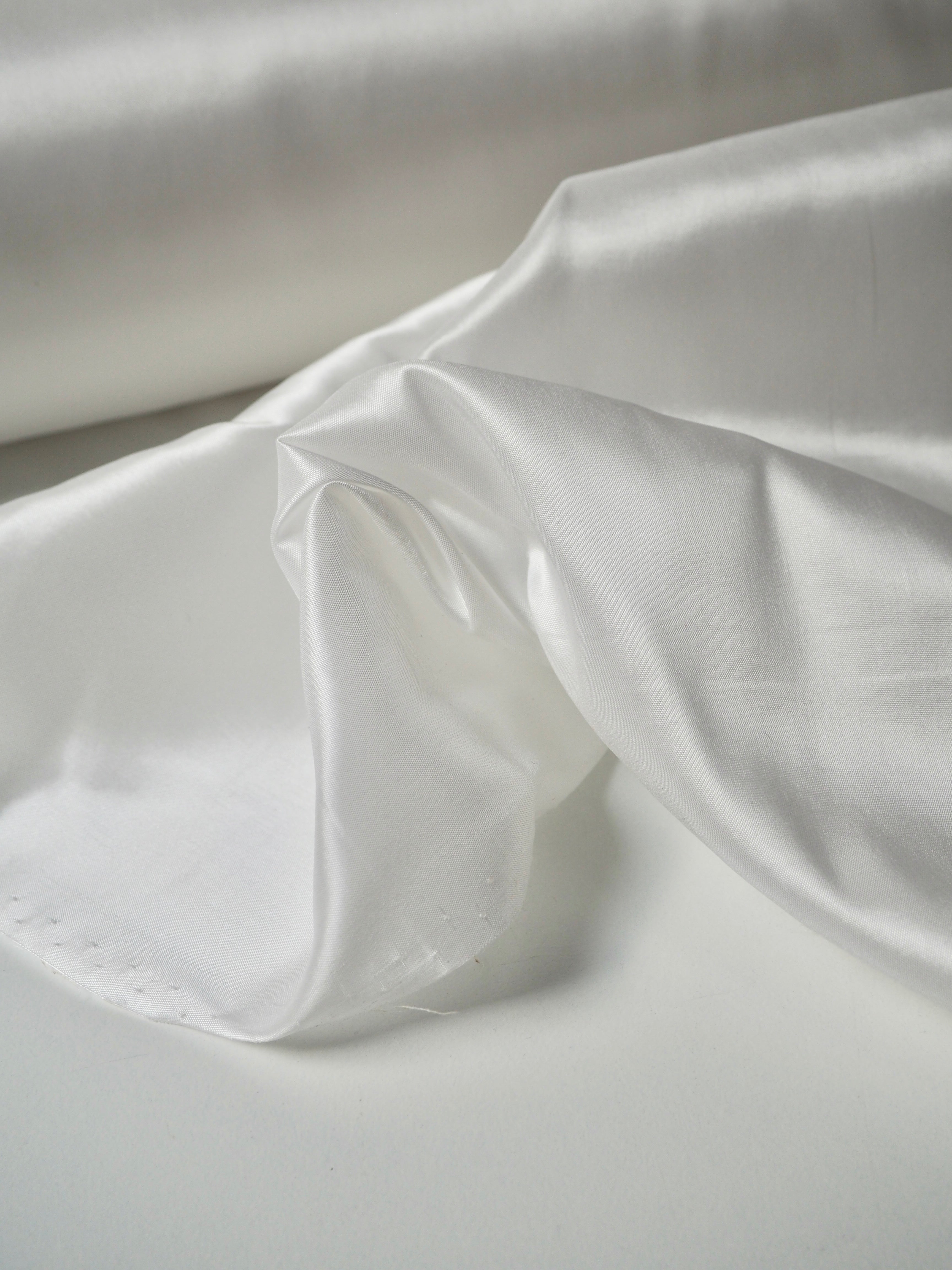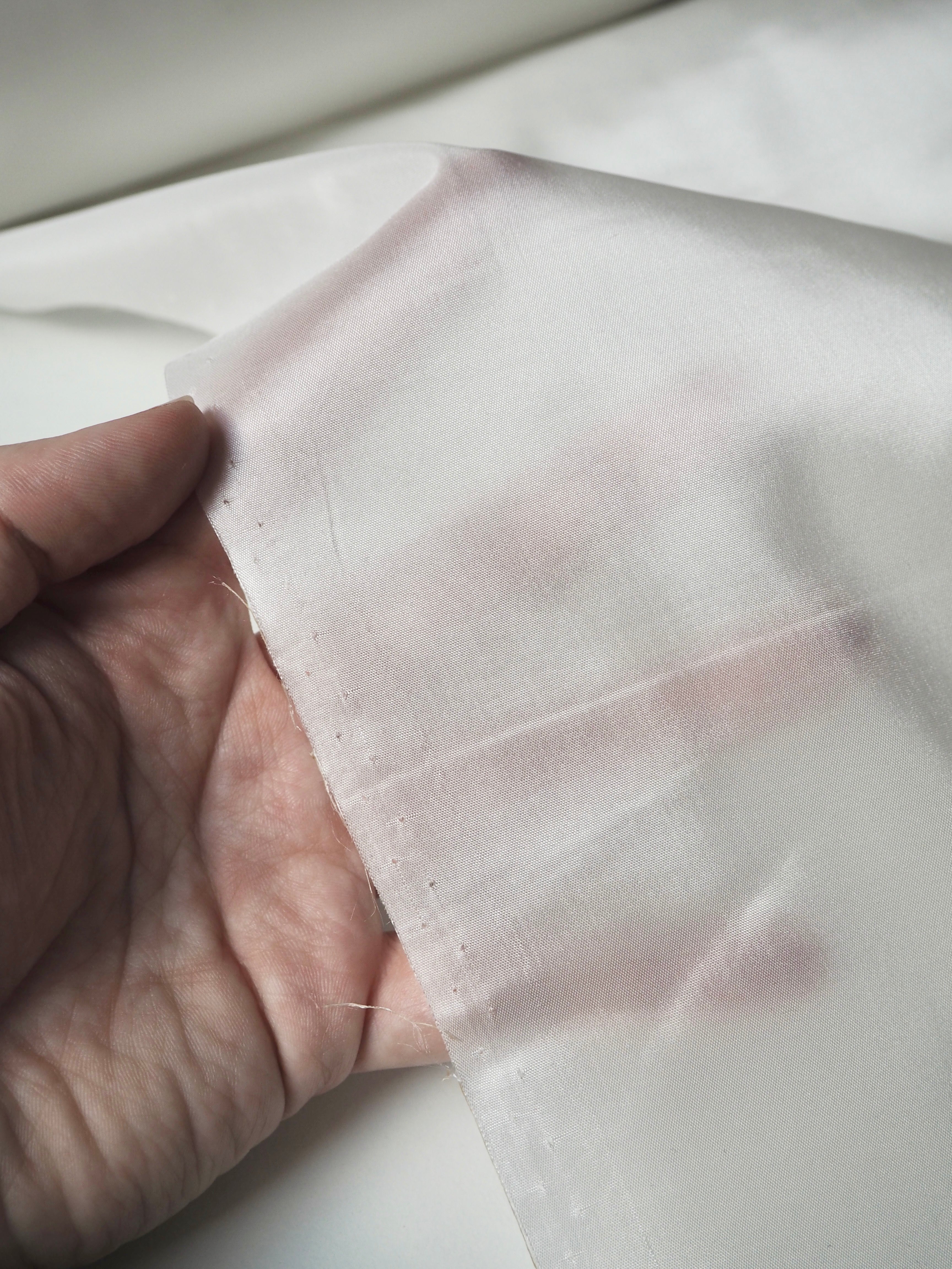 This ex-designer fabric is a lining. It has a plain weave in a soft acetate fibre. Has about 10% stretch, width-ways. Lightweight with a gentle structure and light satin finish. holds shape quite well, and is semi-opaque. Ideal for lining any garment, especially for bridal!