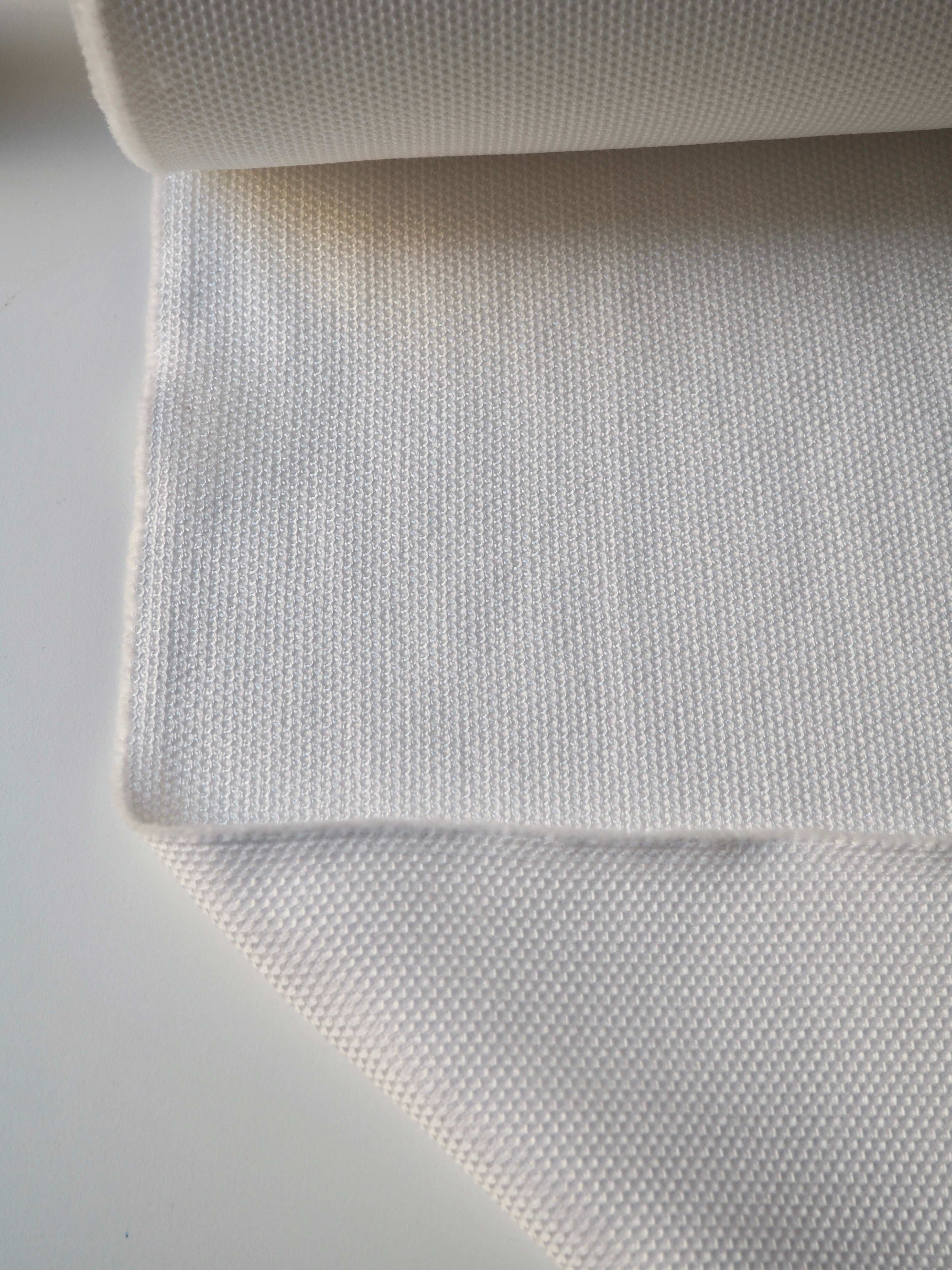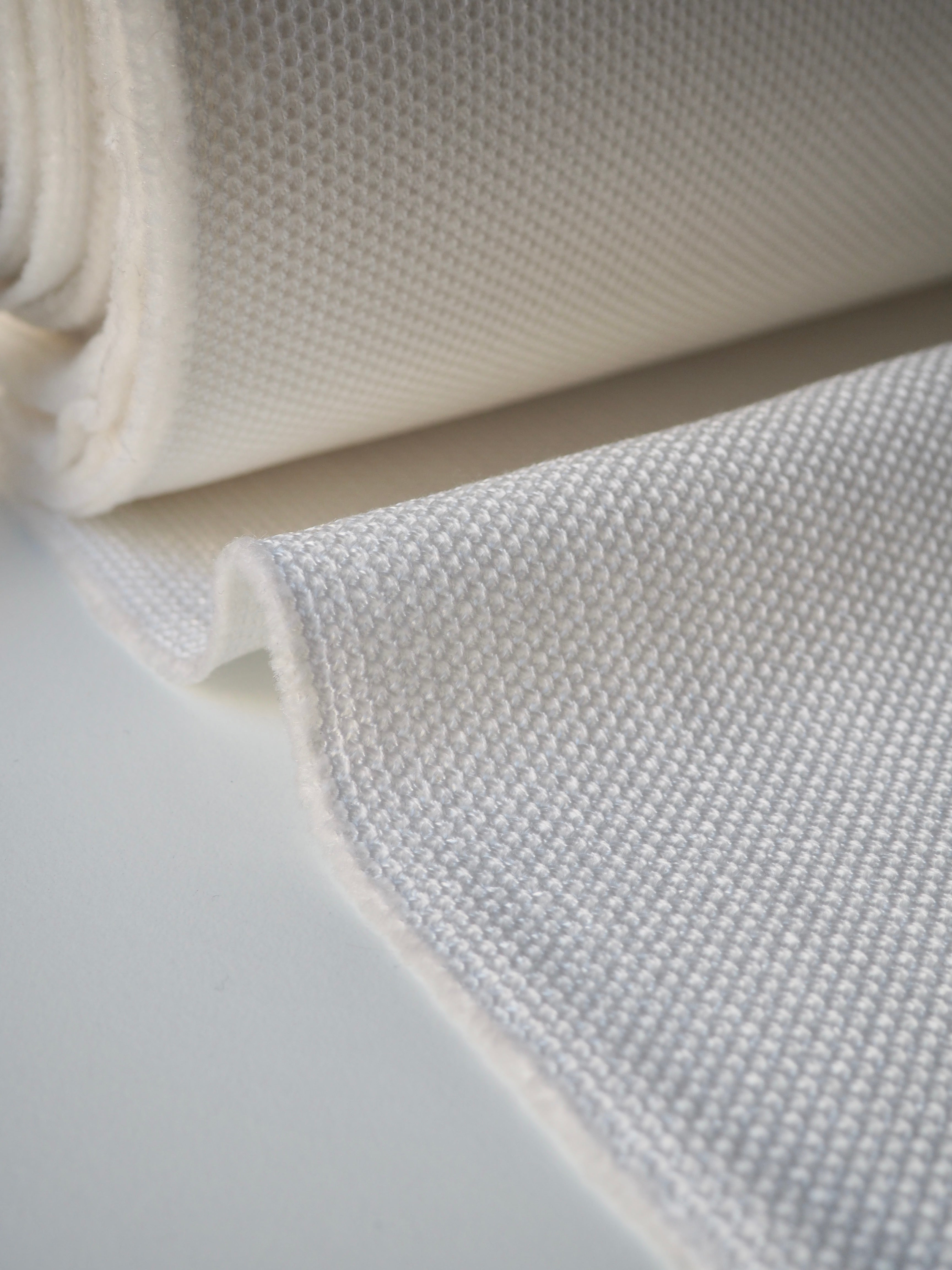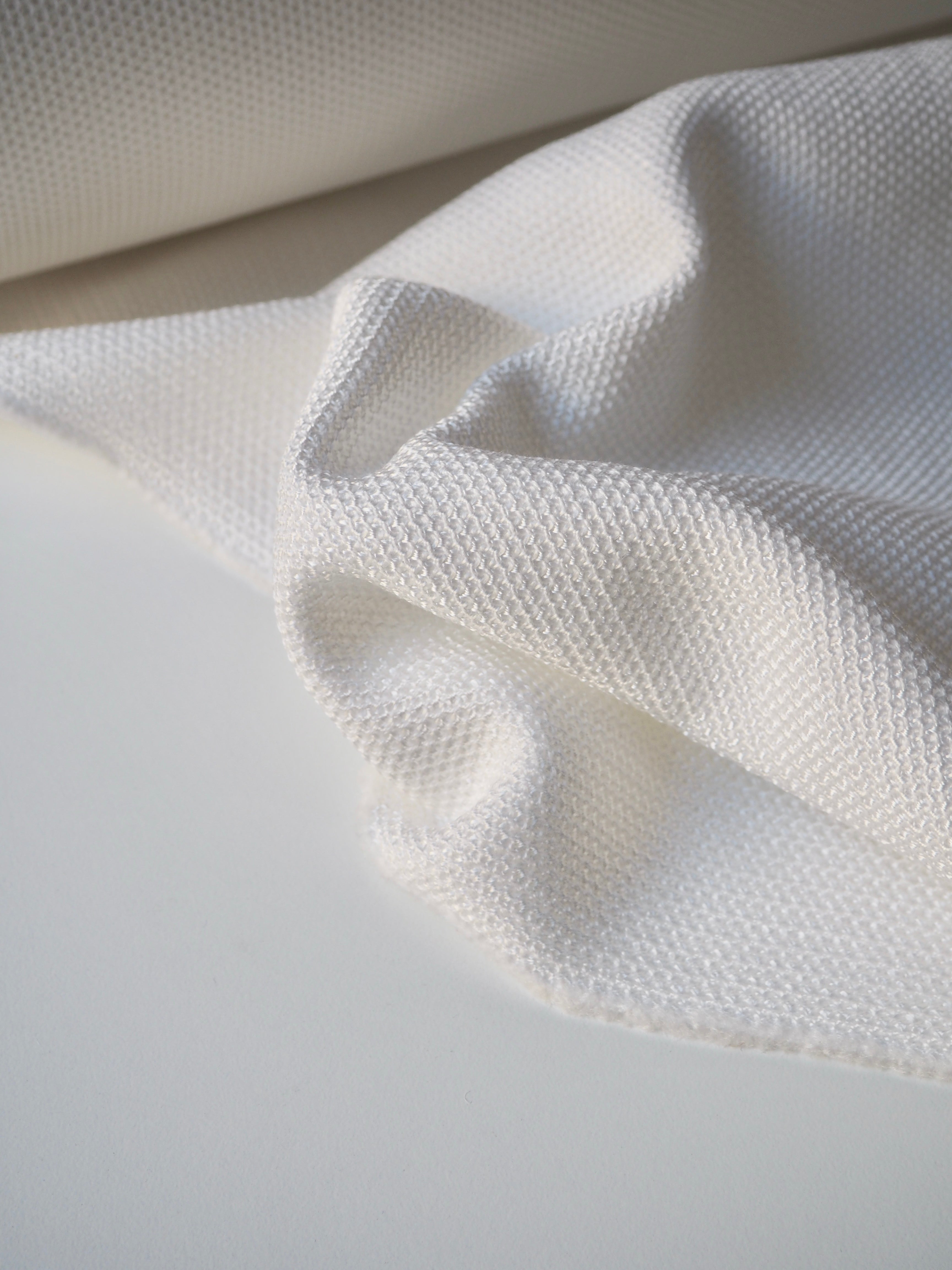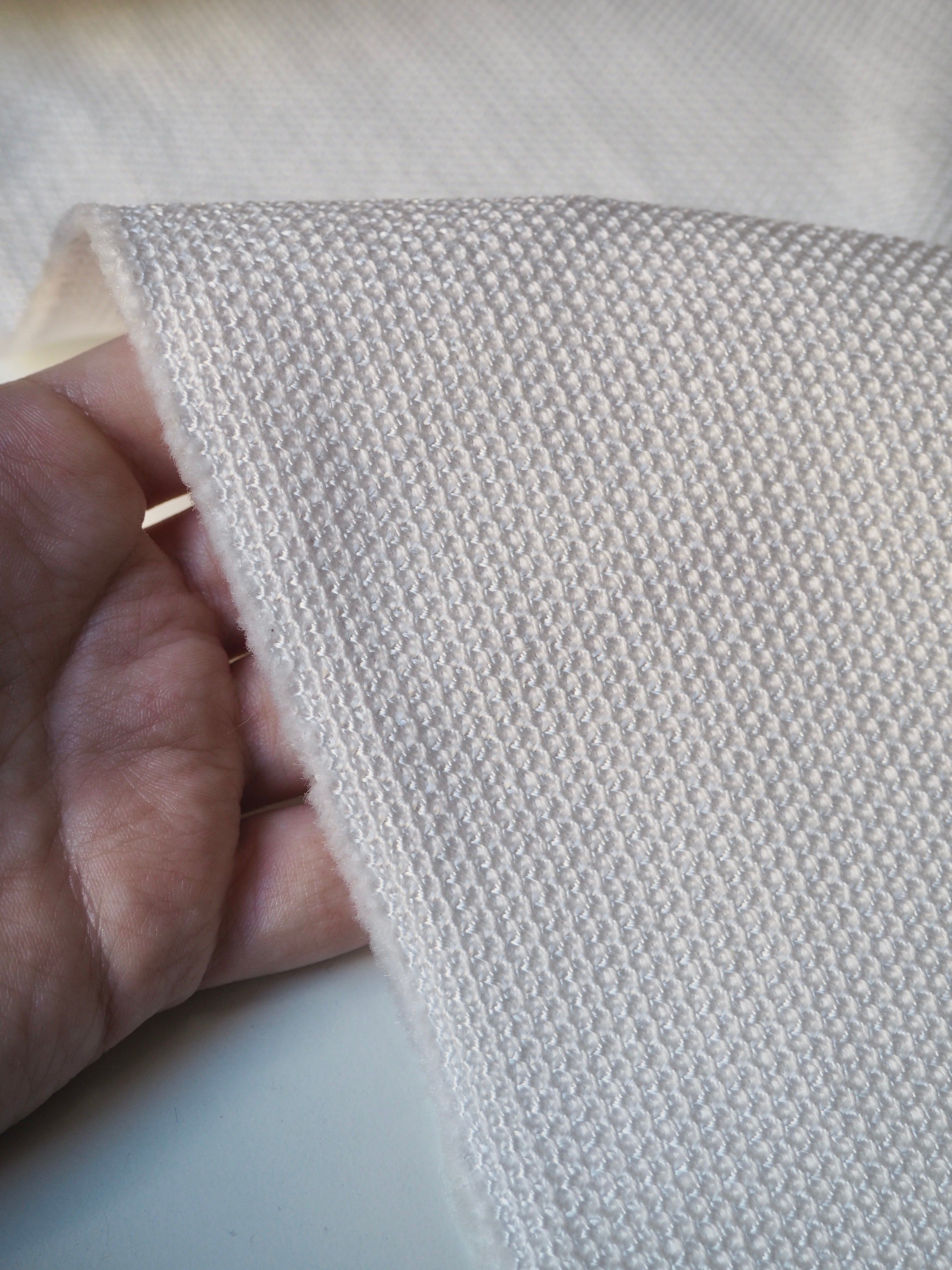 This ex-designer fabric is a jacquard. It's a dotted weave, almost like a golf ball, with a sateen finish. It's medium weight and slightly sponge-y in texture. Opaque and has a soft structure to play with. Great for jackets, or even furnishings!