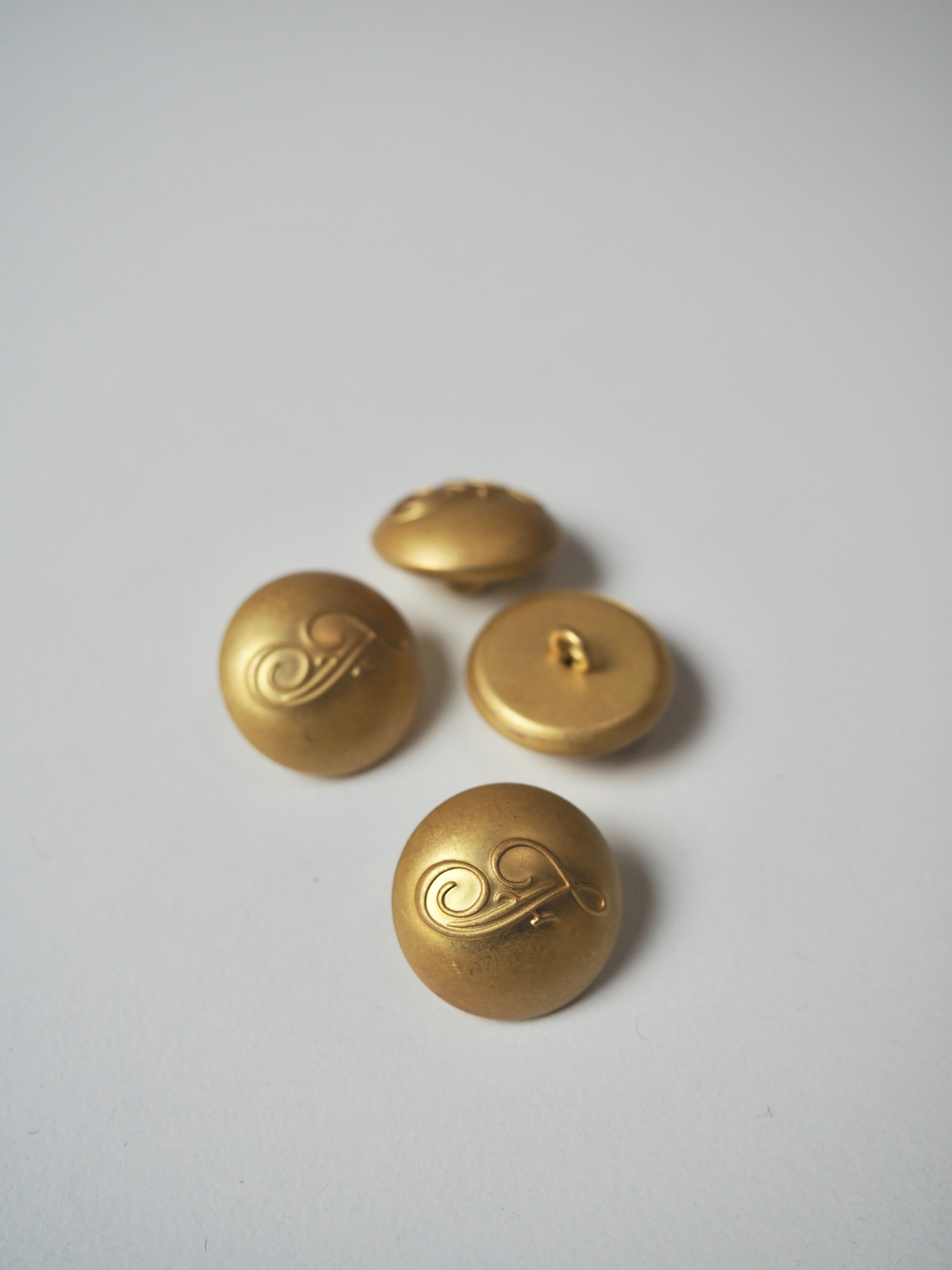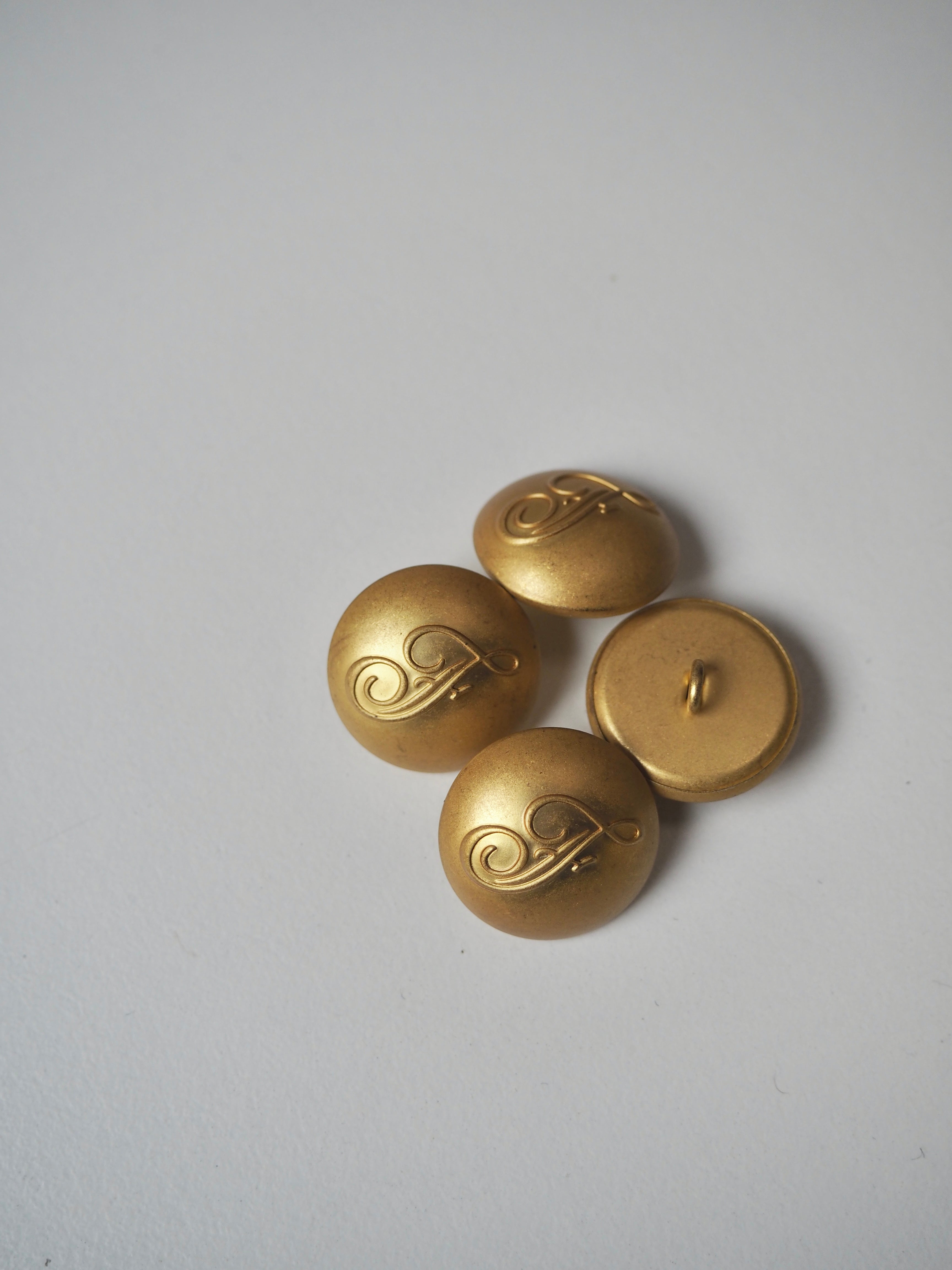 This ex-designer trim is a metal shank button. They have a vintage gold finish and the surface has a raised cursive F detail. Perfect size for coats, jackets and cardigans.