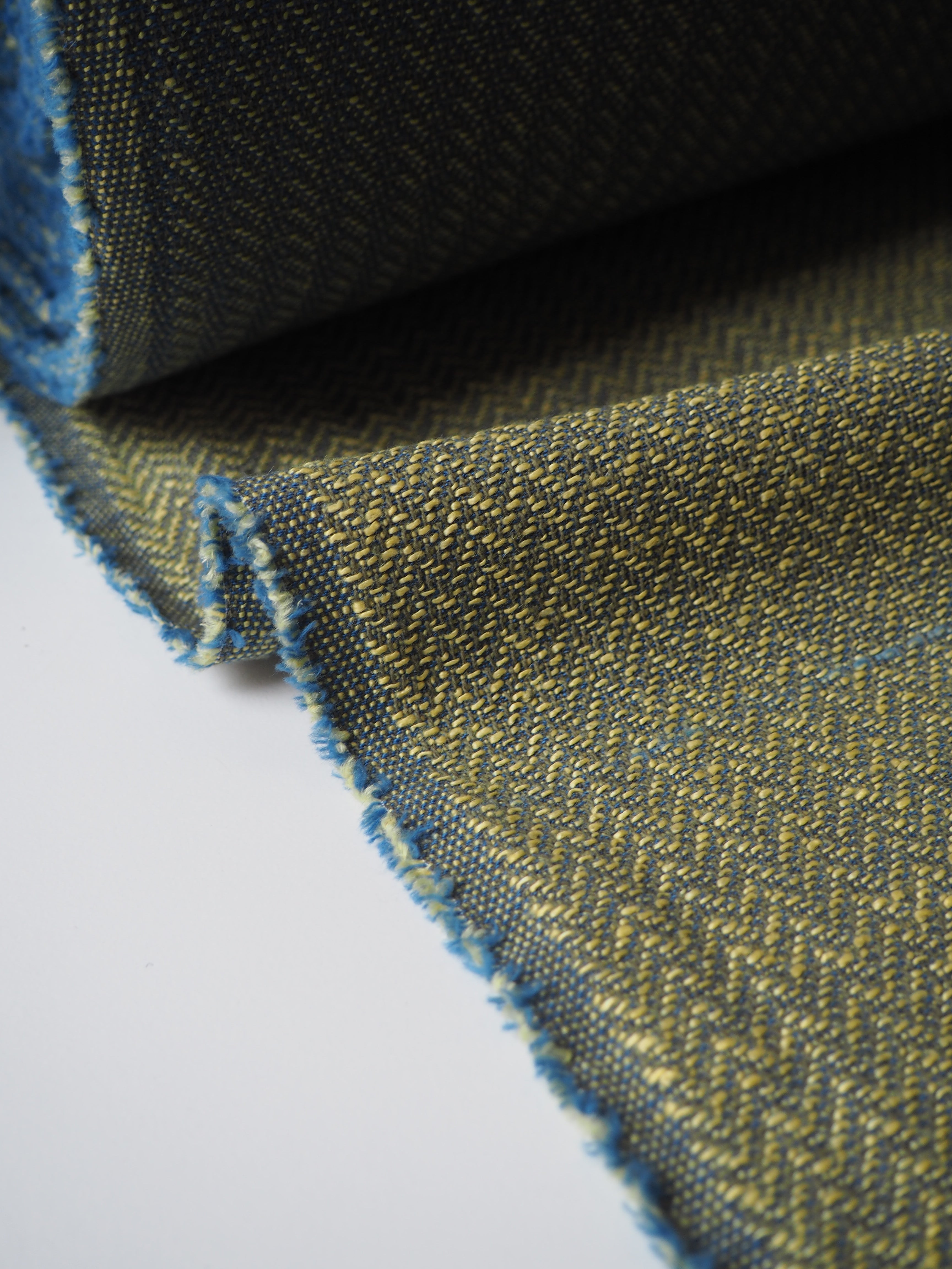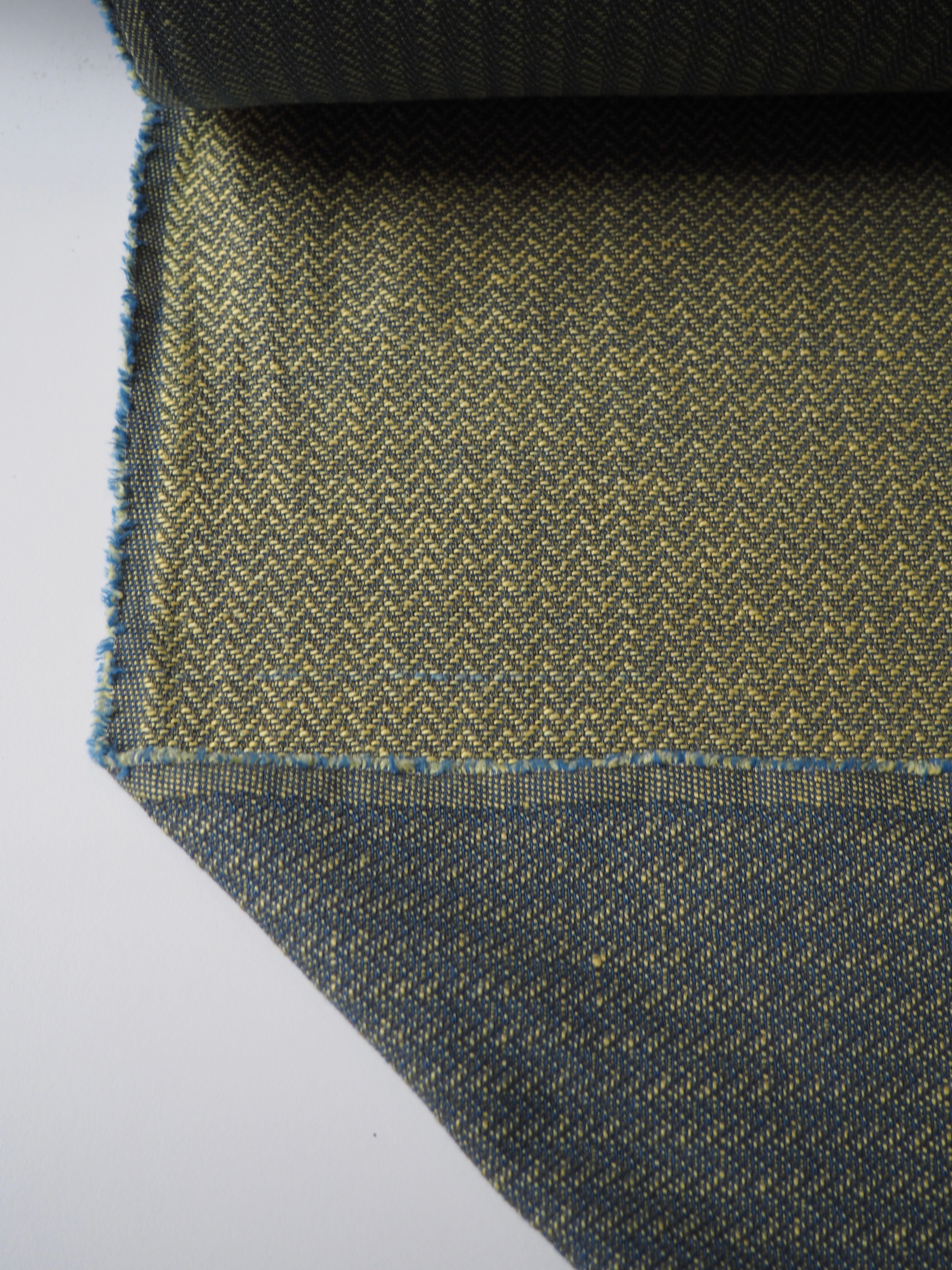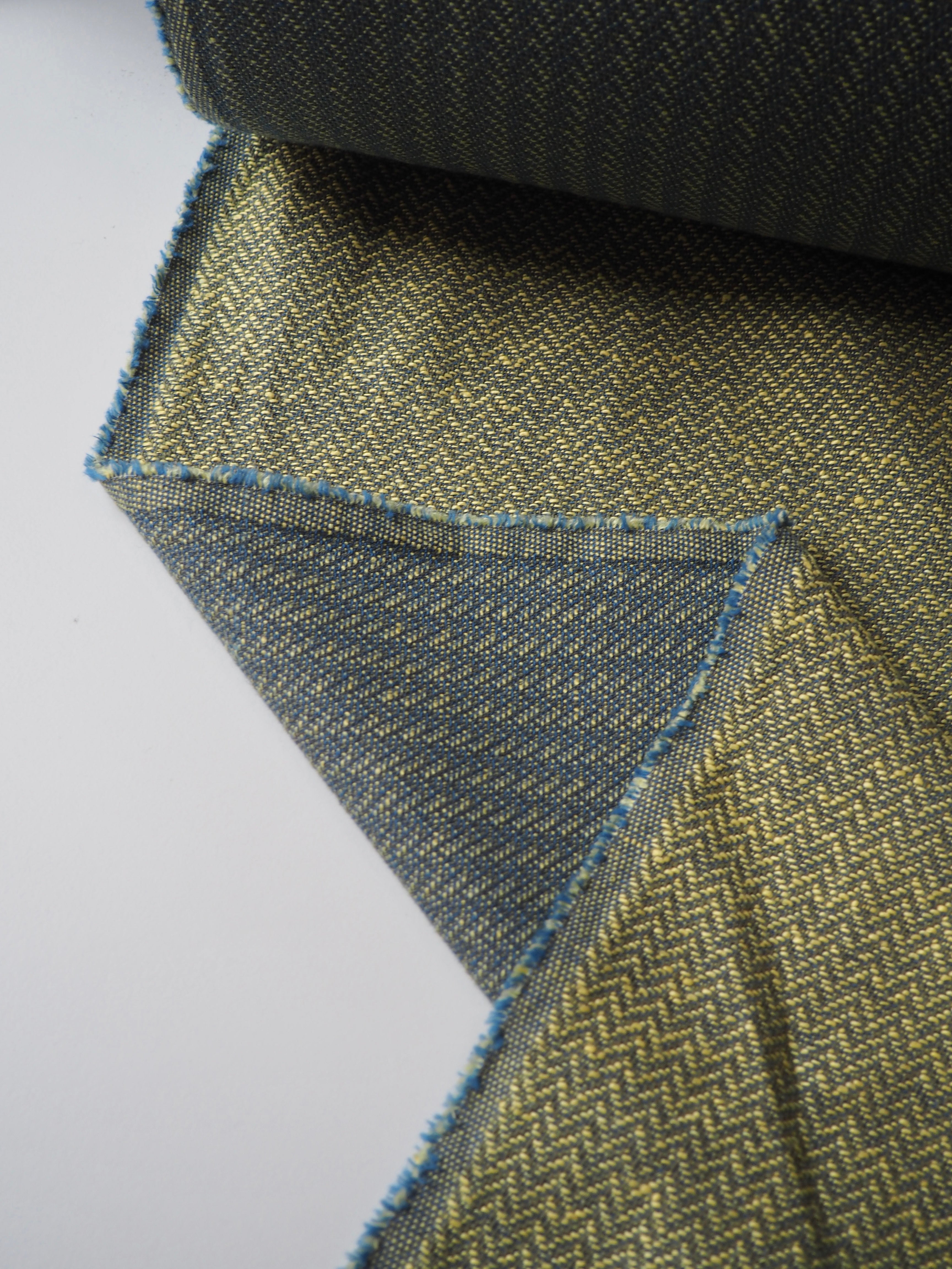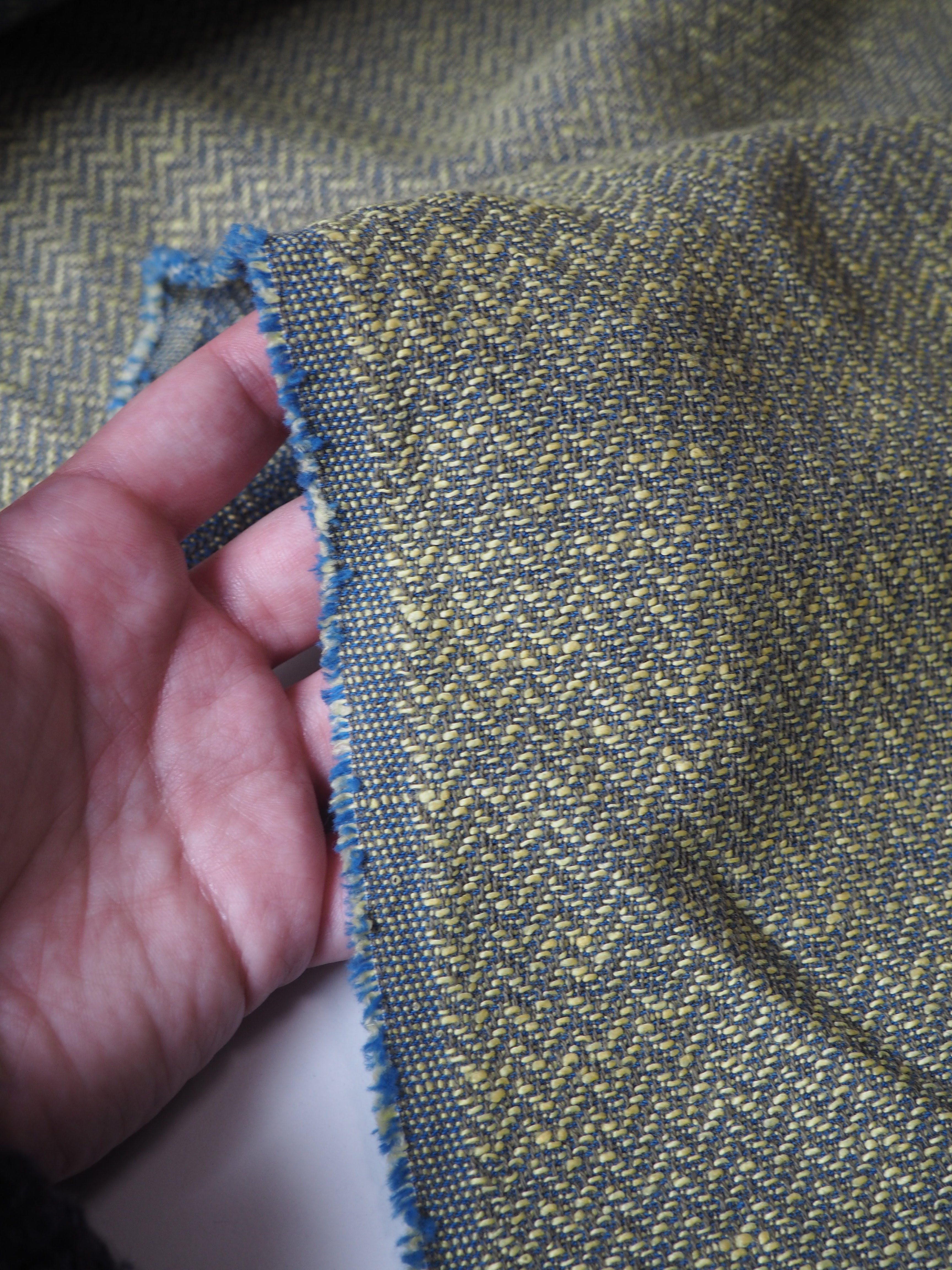 This ex-designer fabric is a jacquard. It's a yellow and blue colourway with a subtle zig zag pattern. It's soft, with a nice texture and lovely cotton handle. Opaque, medium weight, and has a great structure. Perfect for an oversized jacket or for cushions!