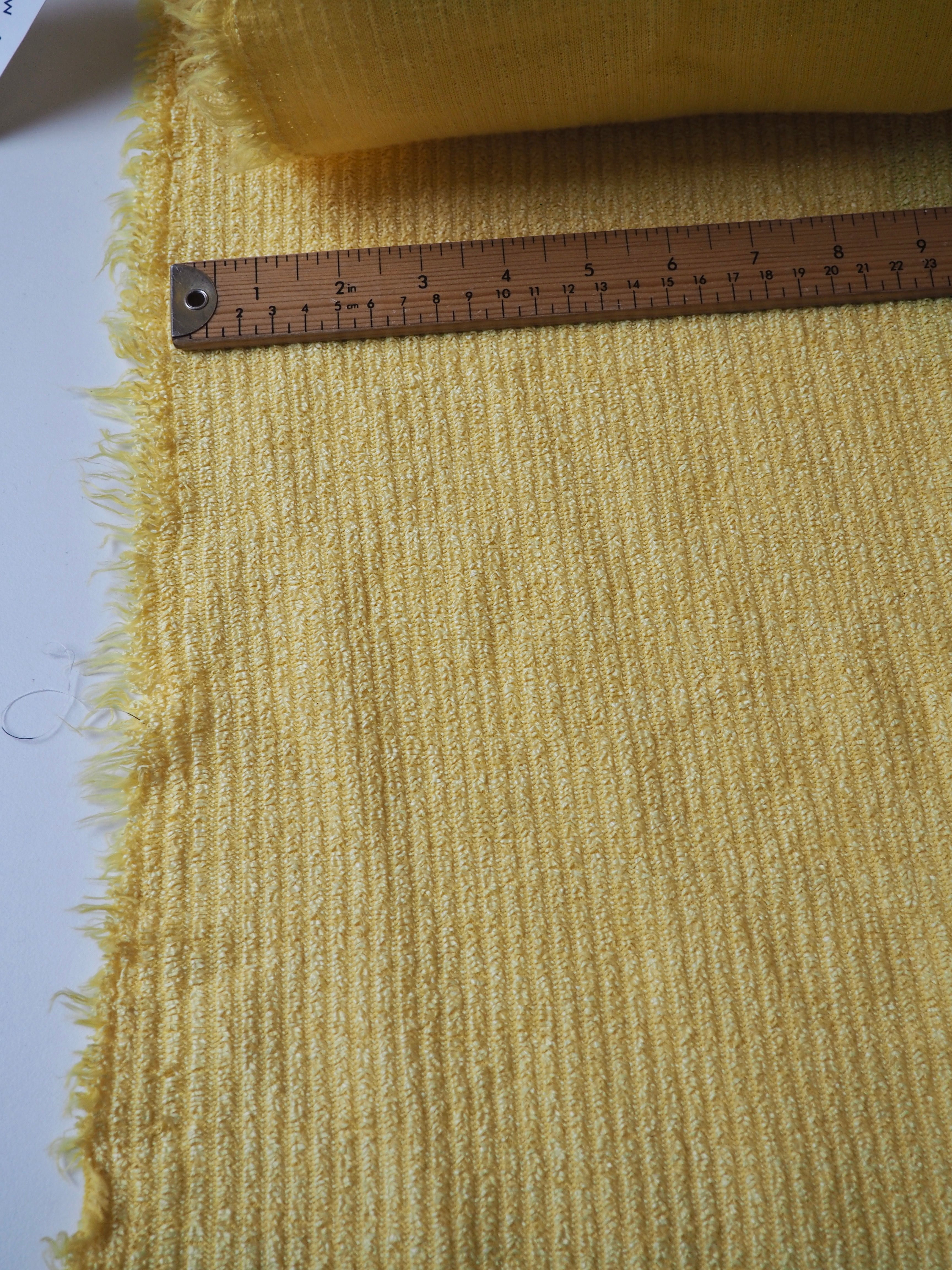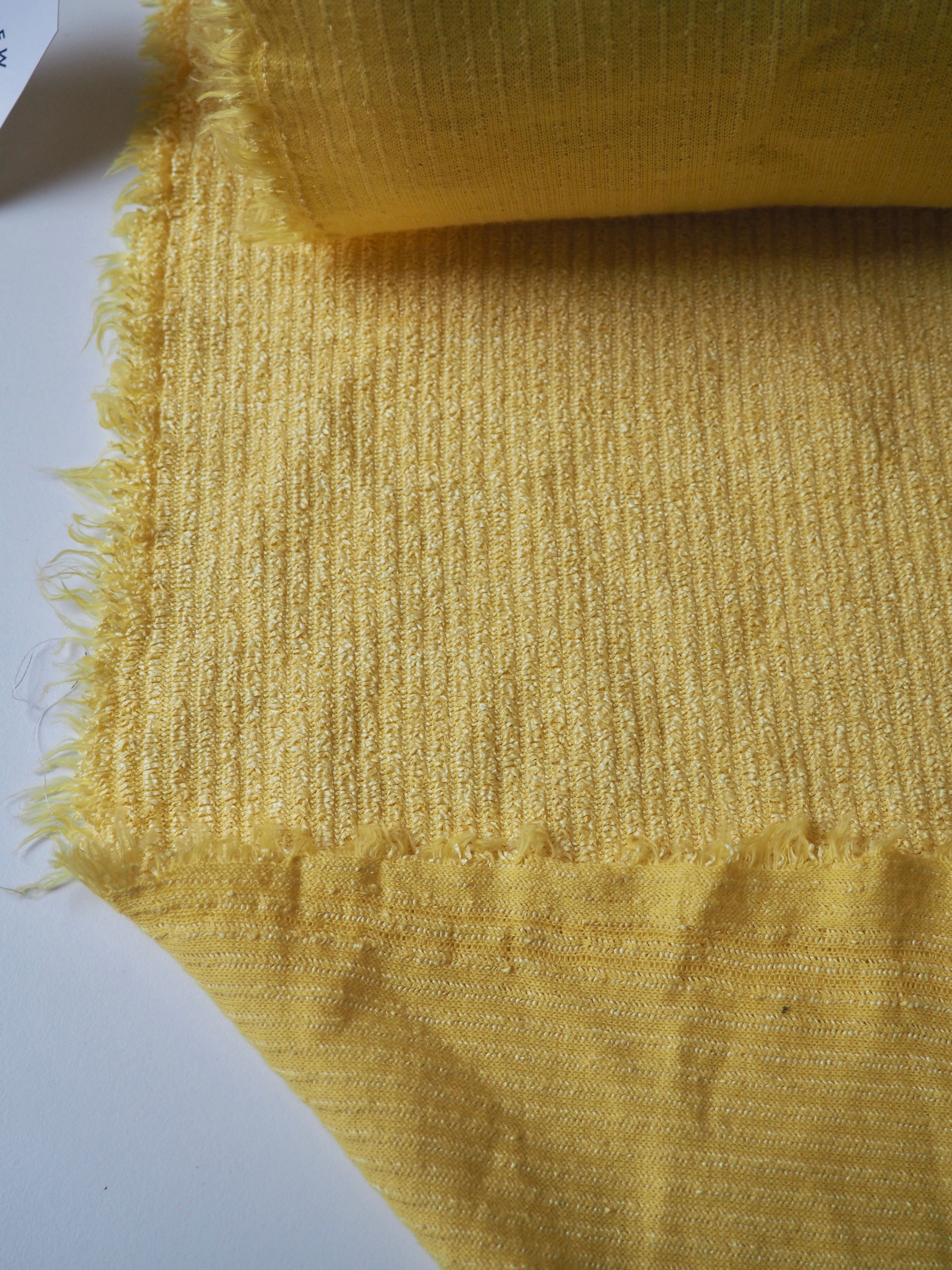 This ex-designer fabric is a unique jersey. It's a bright yellow shade, with a ribbed-looking stripe structure and raffia-like fibres woven in. It gives it a vibrant but unique colour and textured combination. Has a nice textured handle. Medium weight with approximately 20% stretch both ways and a lovely bouncy drape. Slightly sheer due to the mesh weave. Would make the perfect holiday dress or top!