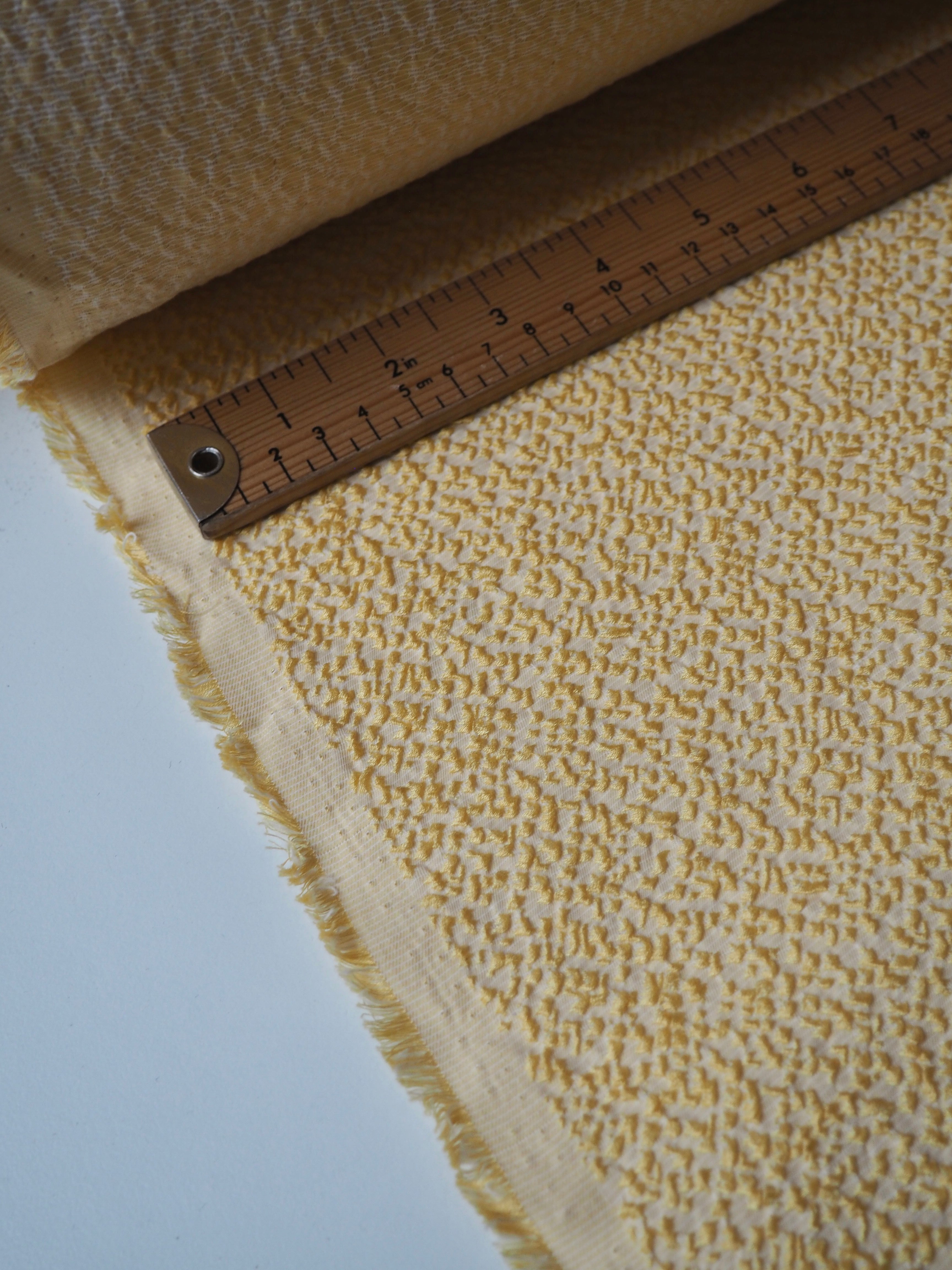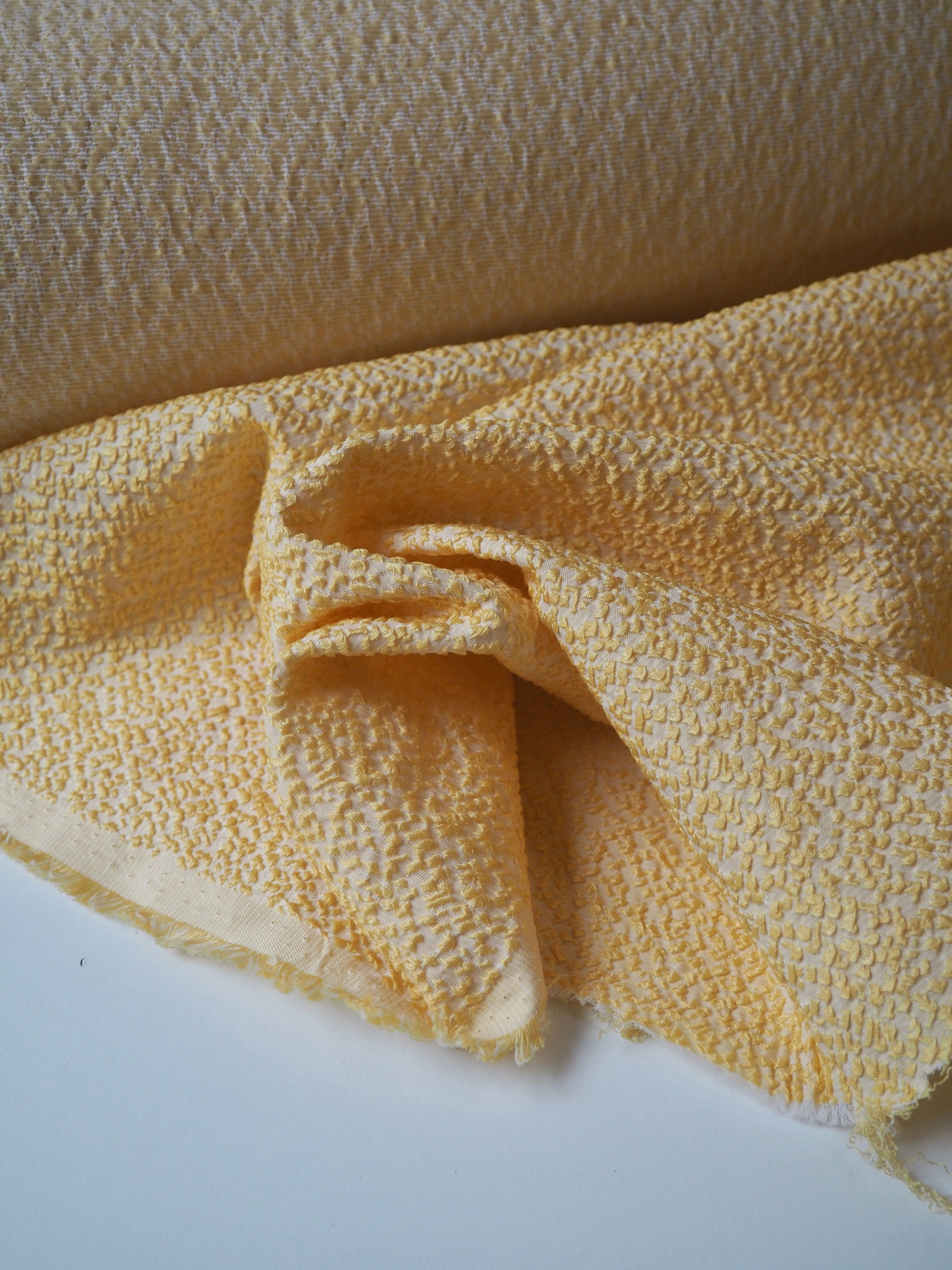 This ex-designer fabric is a jacquard. It has a textured, bumpy, raised topside that's quite interesting, in a cream and yellow mix. Gives it an interesting depth! It's medium weight with a soft and luxurious handle. Has a gentle 10% stretch. Opaque with a good structure to play with. Has a sheen finish as well. Would be great as a top or dress!
